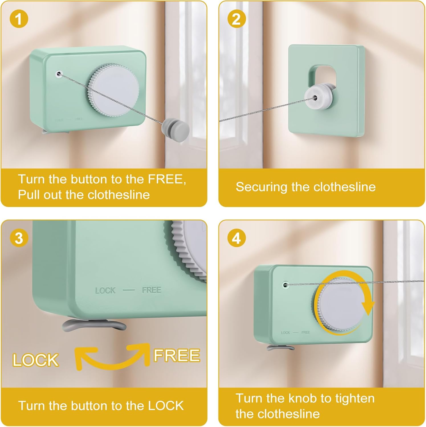 • This is an anti-sagging retractable clothesline indoor/outdoor. While keeping it locked, you can tighten the laundry line retractable by turning the knob in the middle.
