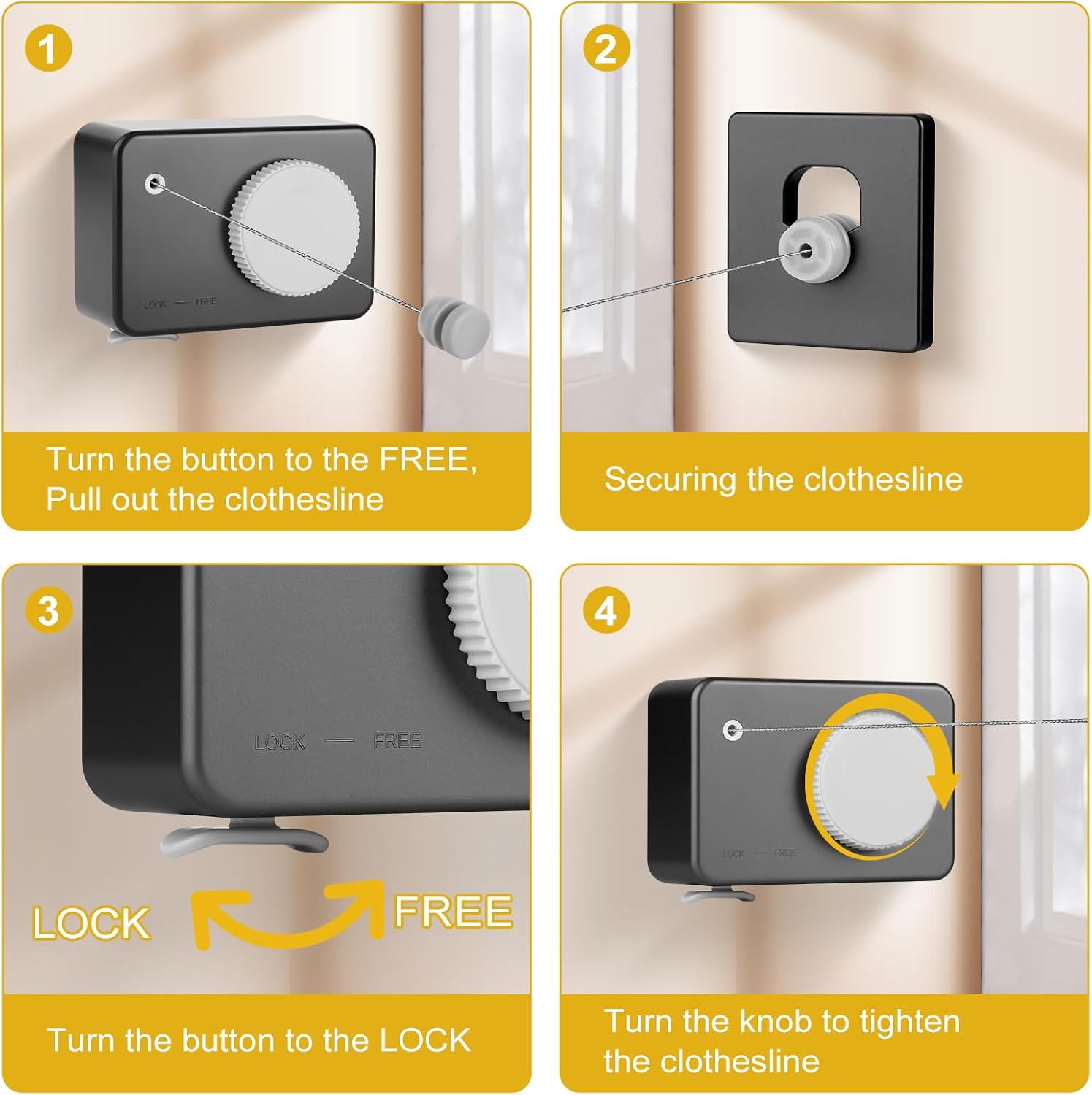 • This is an anti-sagging retractable clothesline indoor/outdoor. While keeping it locked, you can tighten the laundry line retractable by turning the knob in the middle.