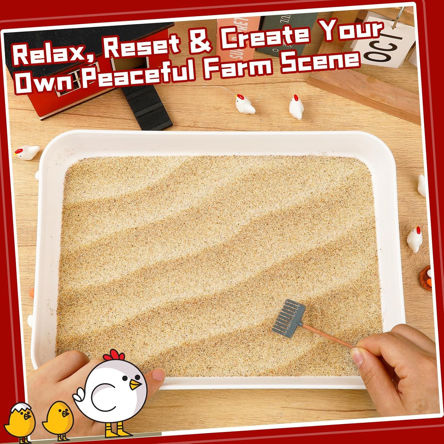 • DIY Stress Relief Activity: Take a mindful break and build your own little farm. Assemble the barn, arrange the chickens and eggs, and rake the sand to create soothing patterns. This interactive zen garden is perfect for sparking creativity, relieving tension, and giving your brain a gentle reset anytime during your busy day.
