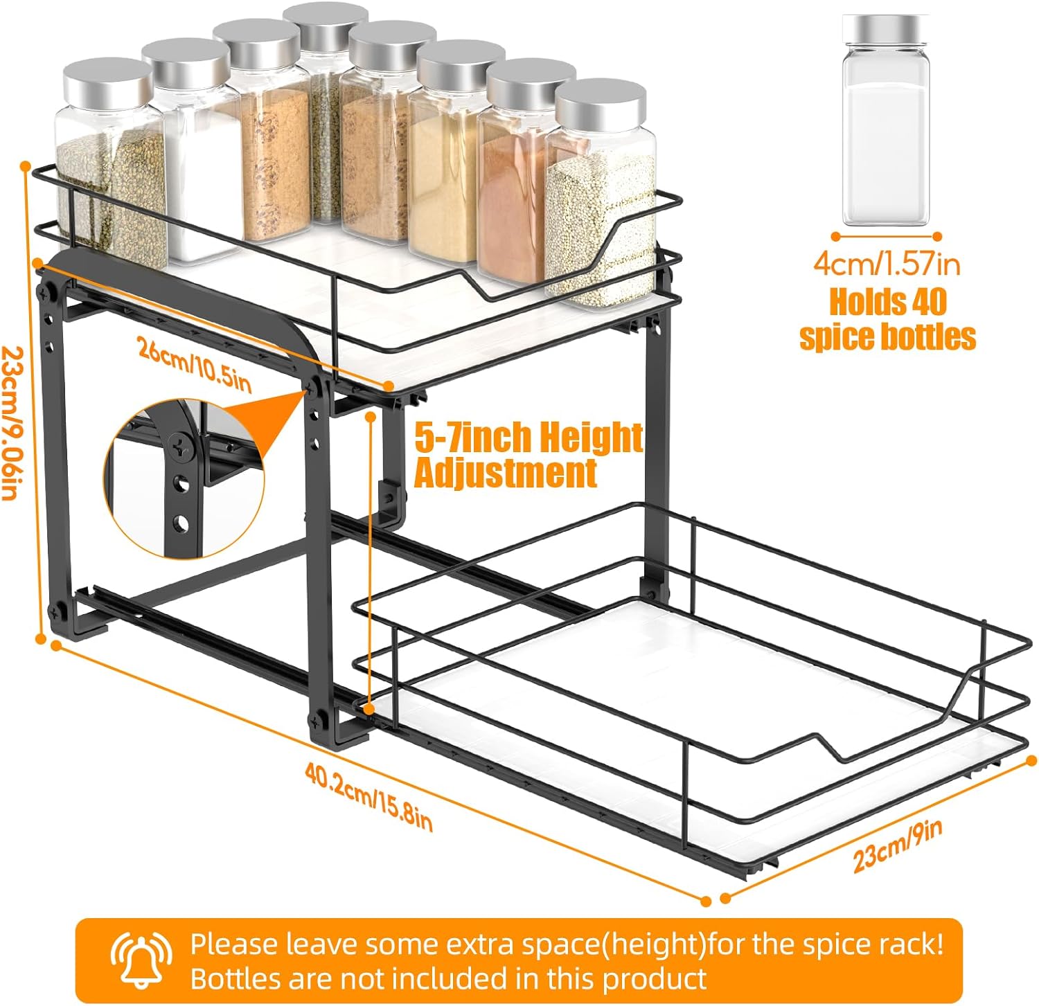 • Double-Tier Pull-Out Design for Maximum Storage: Maximize your cabinet or pantry space with our vertical spice rack pull out. The 2-tier design lets you store up to 40 spice jars (jars not included with this product), keeping your kitchen countertops clutter-free and your spices within easy reach. Each tier pulls out independently, so you get unobstructed access to all your items.