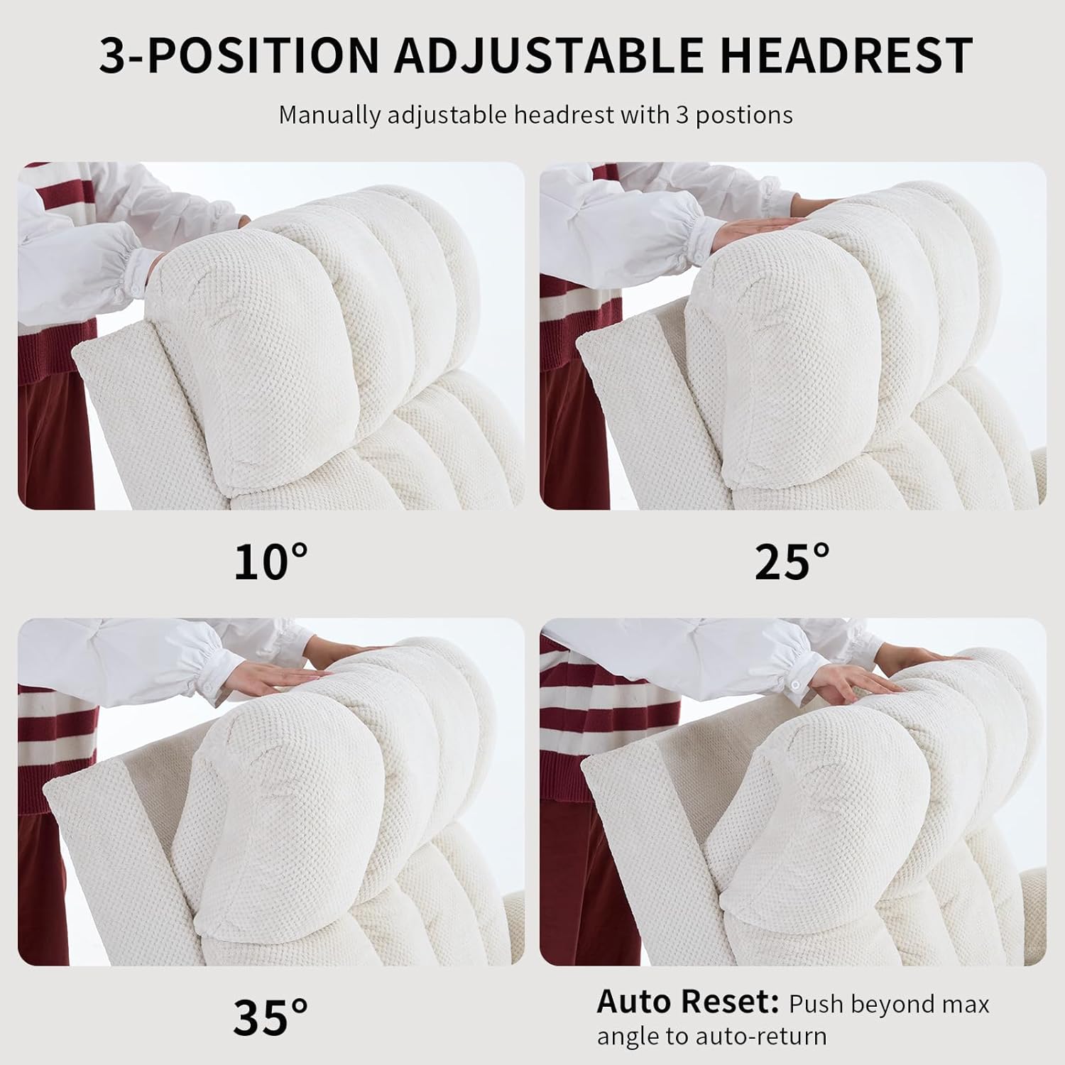 • Manual Headrest adjustment: Electric recliner chairs with adjustable headrests, There are three adjustable levels in total:10°,25°,35°. You can adjust different angles according to your application scenarios. allowing you to watch TV or lean back without straining your neck or head, for personalized comfort