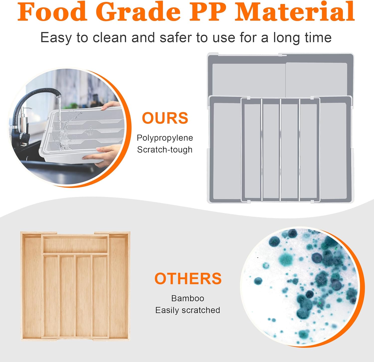 • 【Premium Food Grade Material for Safety】: Crafted from thick, sturdy food-grade PP material, our utensil drawer organizer is built to last. It’s also BPA-free, ensuring that your kitchen utensils stay safe for your family’s health. Cleaning is a breeze—simply rinse with water or wipe with a cloth. Just avoid the dishwasher to keep your flatware organizer for drawer in top condition!
