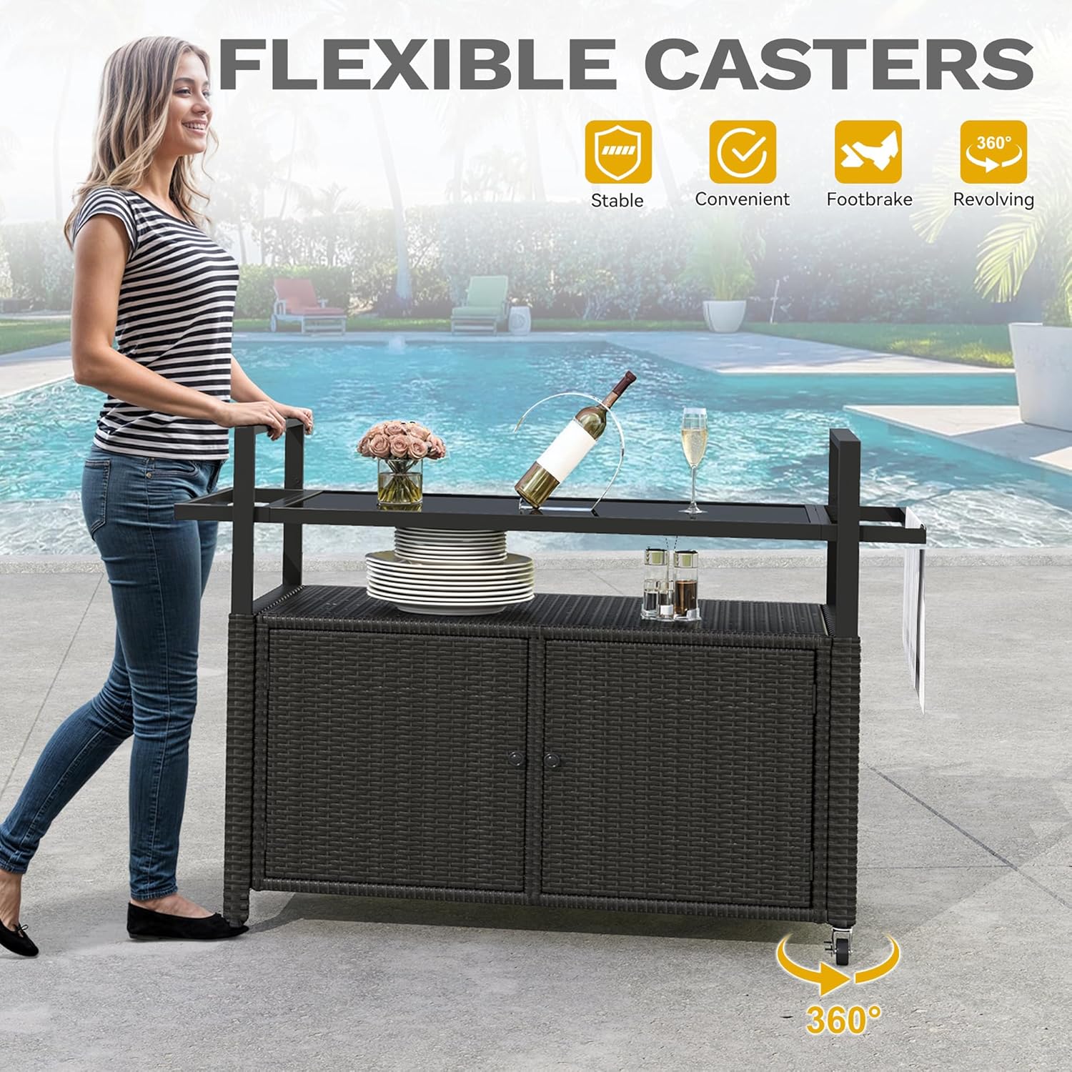 • Effortless mobility: Equipped with smooth 360-degree wheels, this portable outdoor cart effortlessly glides to any desired location, providing convenience and flexibility