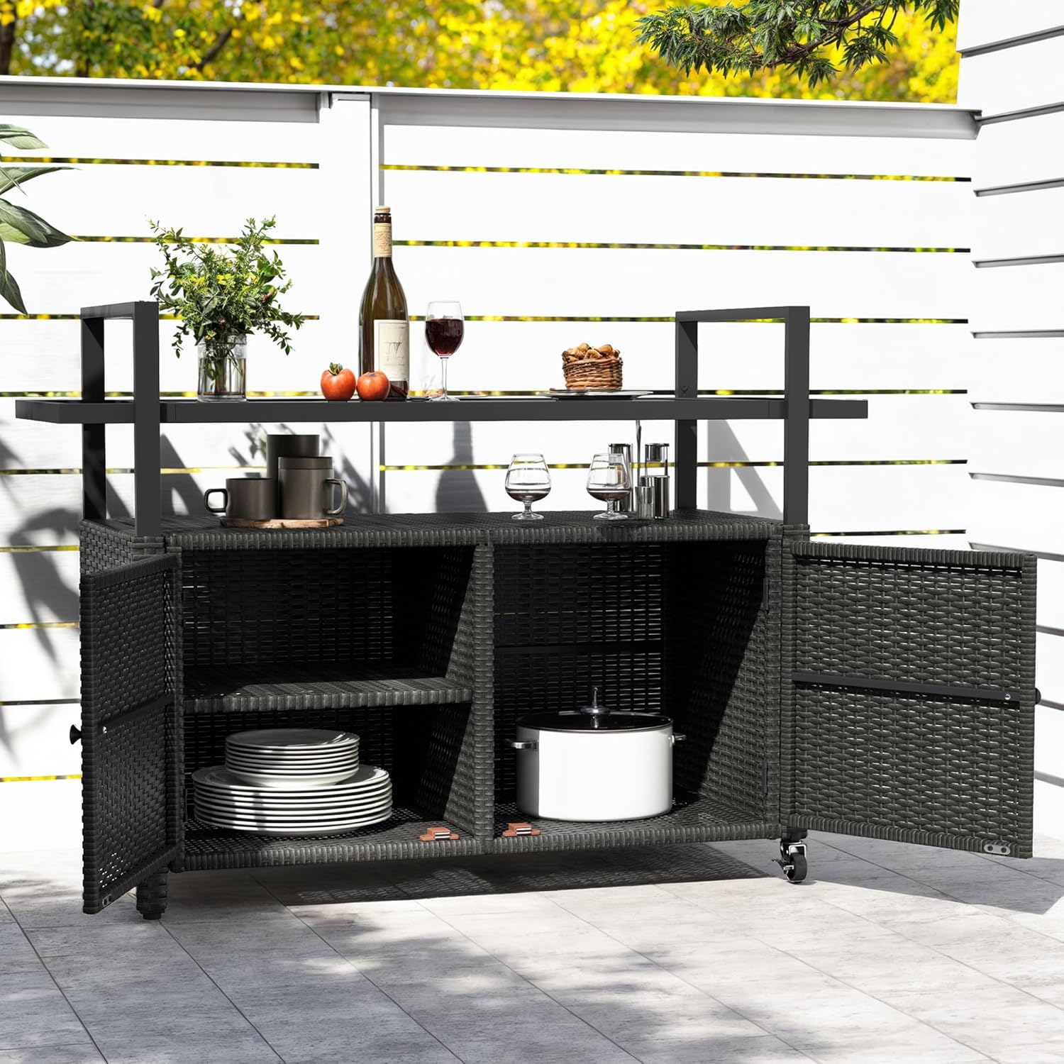 DWVO Patio Bar Table,Outdoor Kitchen Island with Glass Top,Rattan Patio Storage Cabinet with Wheels,Bar Cart for Poolside and Backyard,Black