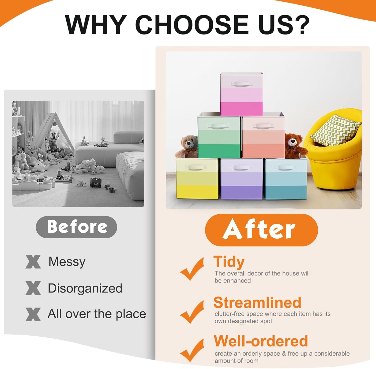• Gradient tones: Elevate your organization with a touch of gradient perfection. Our set of 6 gradient-colored fabric storage cubes comes in an array of delightful hues: sky blue, rose pink, yellow, pink, lavender purple, and turquoise green. Each bin measures 10½"L x 10½"W x 11"H, perfectly sized to slot into your existing shelves or cabinets, adding a splash of color while keeping your space tidy