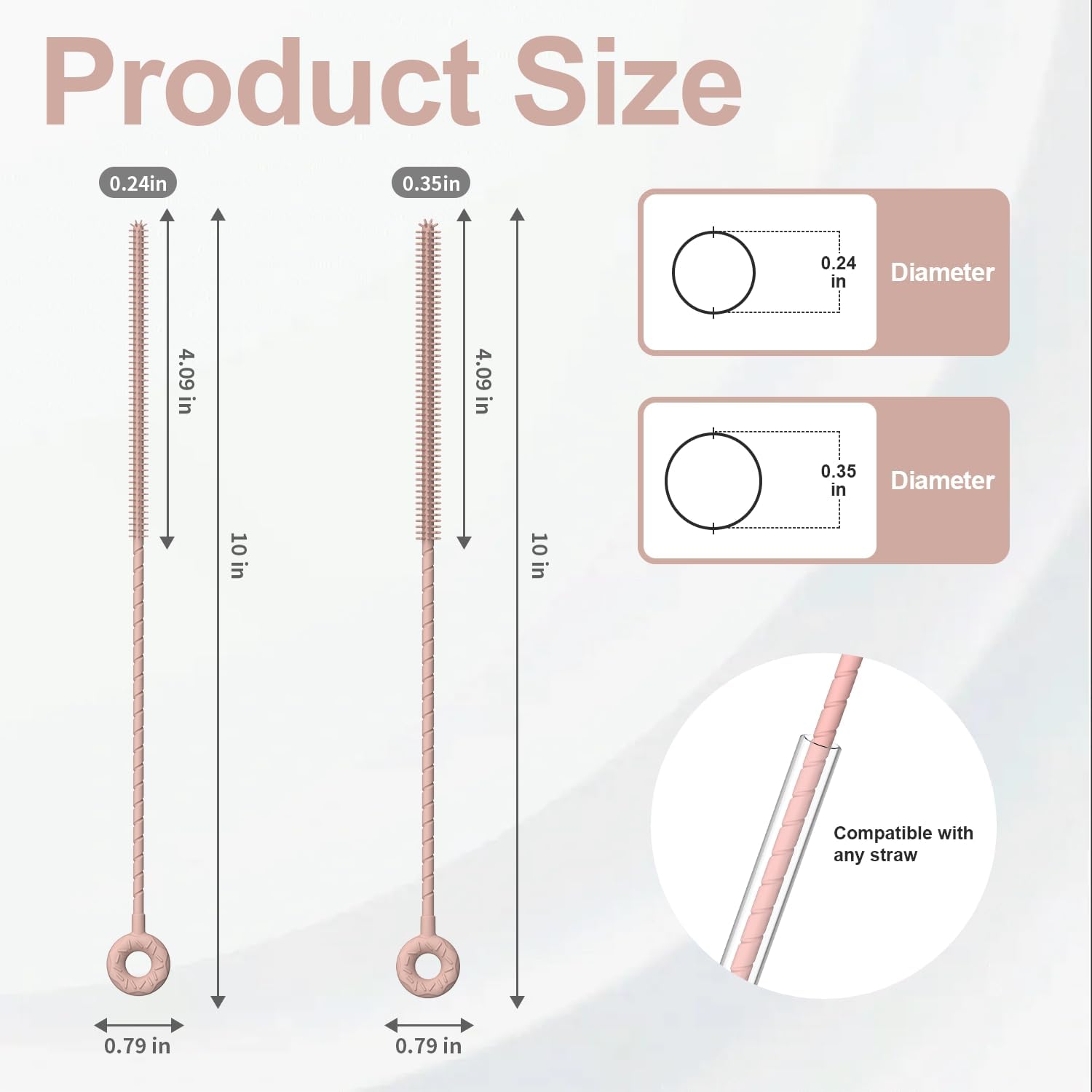 • Multi-Scenario Application: This silicone straw cleaner brush set features 0.24" (6 mm) and 0.35" (9 mm) diameters, 10" (254 mm) long, designed to perfectly clean both narrow reusable straws and wider straws, reaching deep inside to remove residue and grime.