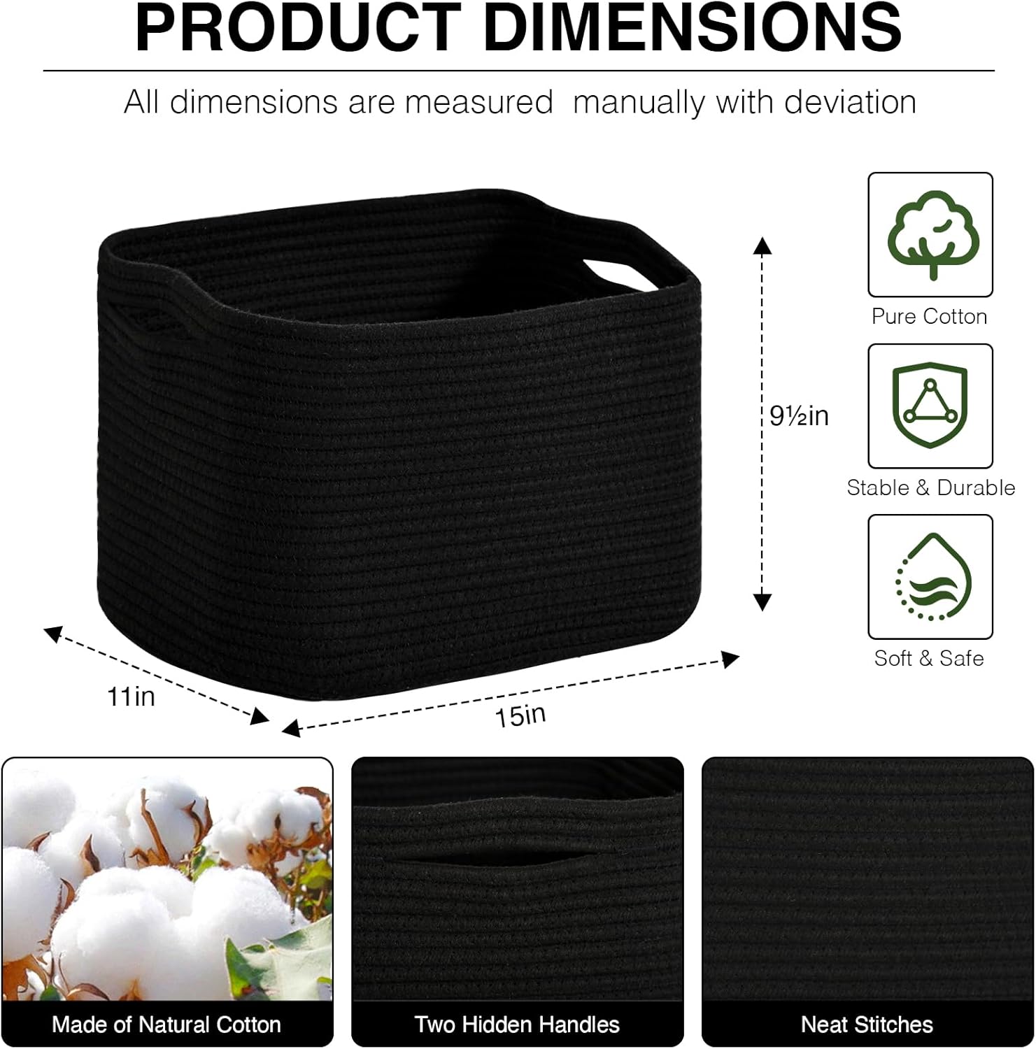 Woven Cotton Rope Storage Basket for Organizing, Cute Decorative Baskets for Gifts Empty, Organizer Bins for Dog Toy, Baby Laundry, 15“×11”×9.5“, Black