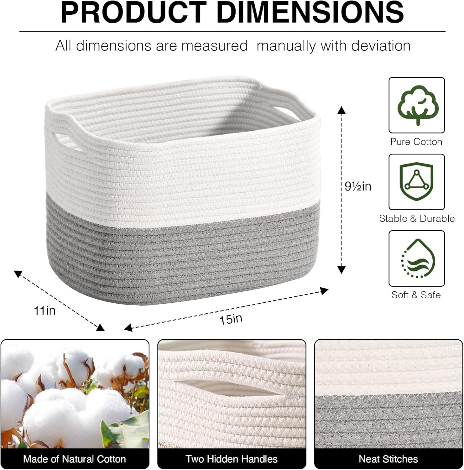 Woven Cotton Rope Storage Basket for Organizing, Cute Decorative Baskets for Gifts Empty, Organizer Bins for Dog Toy, Baby Laundry, 15“×11”×9.5“, Off White & Grey