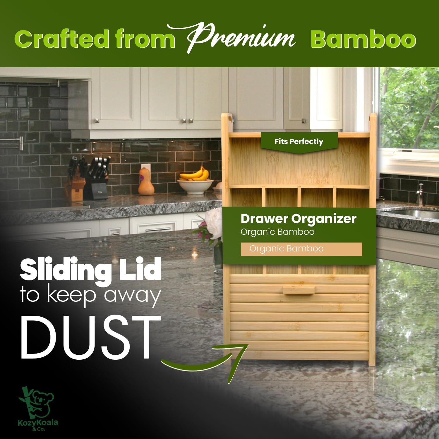 KozyKoala & Co. Bamboo Drawer Organizer with Sliding Lid - 5 Slot Kitchen Drawer Organizer & Utensil Holder - Wood Bamboo Cutlery Tray for Flatware, Gadgets & Multipurpose Storage for Home & Office