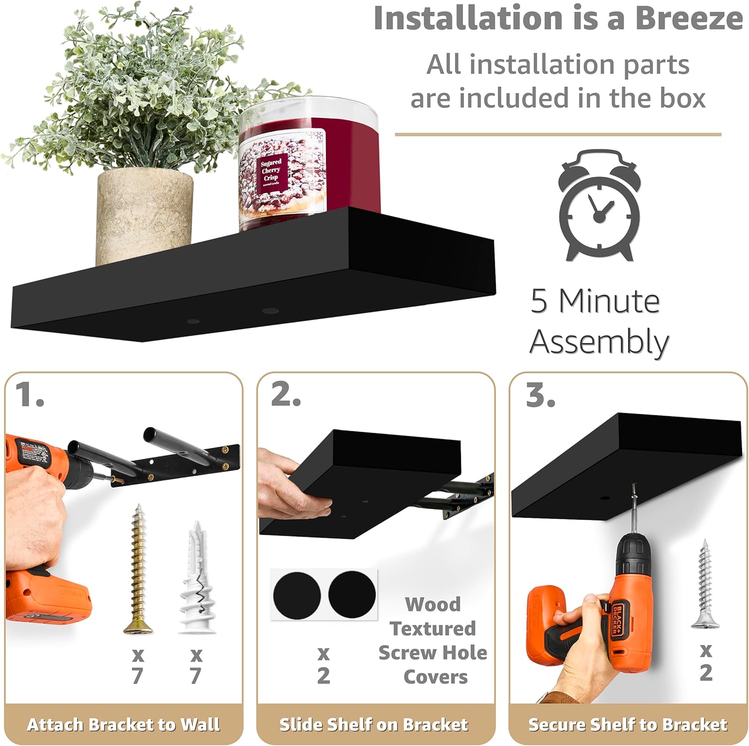 • Easy Installation: Mounting hardware INCLUDED the Hanging shelves are made of beautiful MDF with PVC + Bracket - Sturdy enough to arrange and display your favorite small objects - Attaches firmly to the wall without visible support - Minor assembly required - Supports up to 22 pounds per shelf - Measures approximately 16.25 inch L x 5.50 inch W - Each display shelf 1.5 inch thick