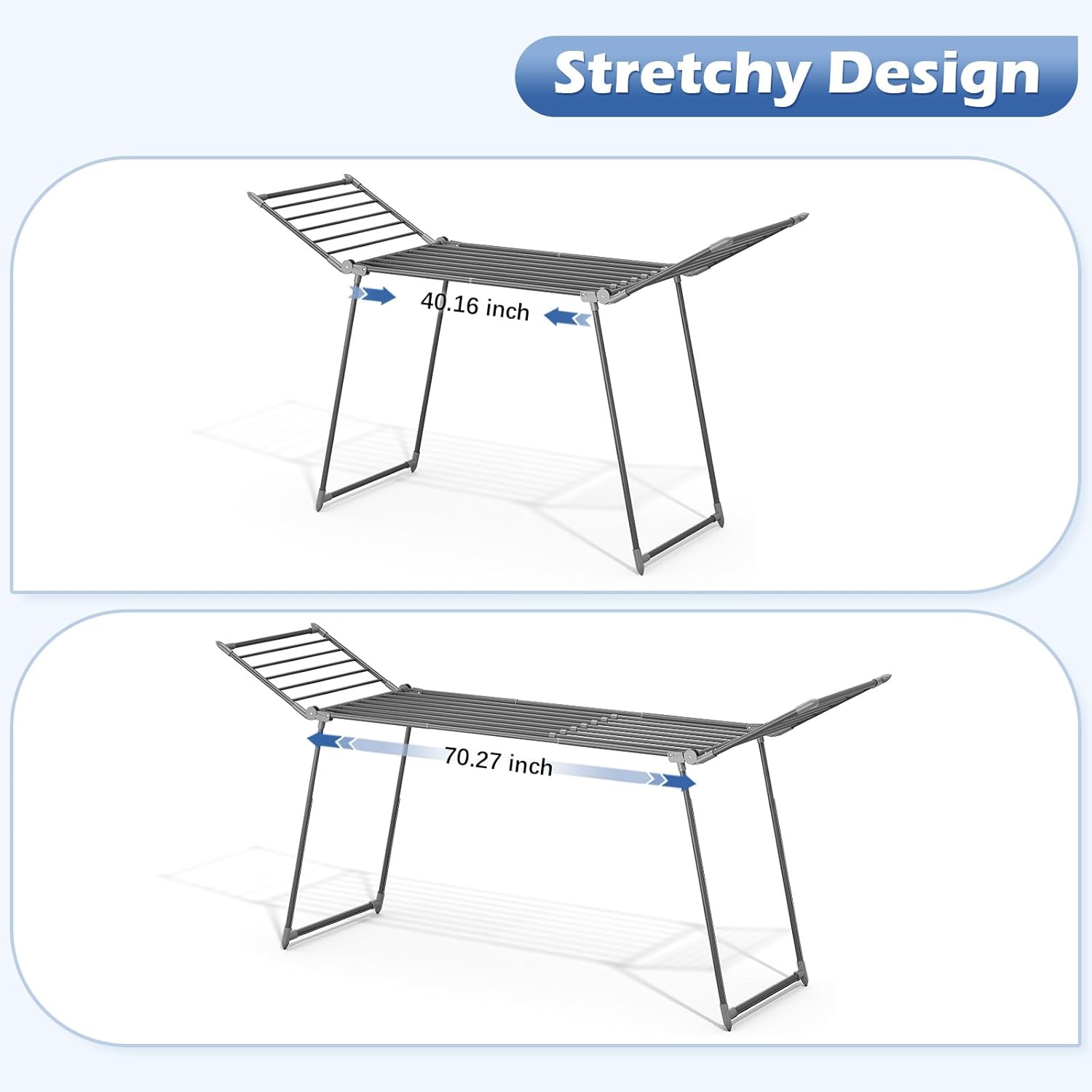 • Stretches Both Ways: Unfold the drying rack first, then stretch it further left and right. Since it's long, use the side "wings" to pull it. Unstretched size: 70.47" x 39.09" x 21.93". Stretched size: 21.9"W x 100"L x 39"H