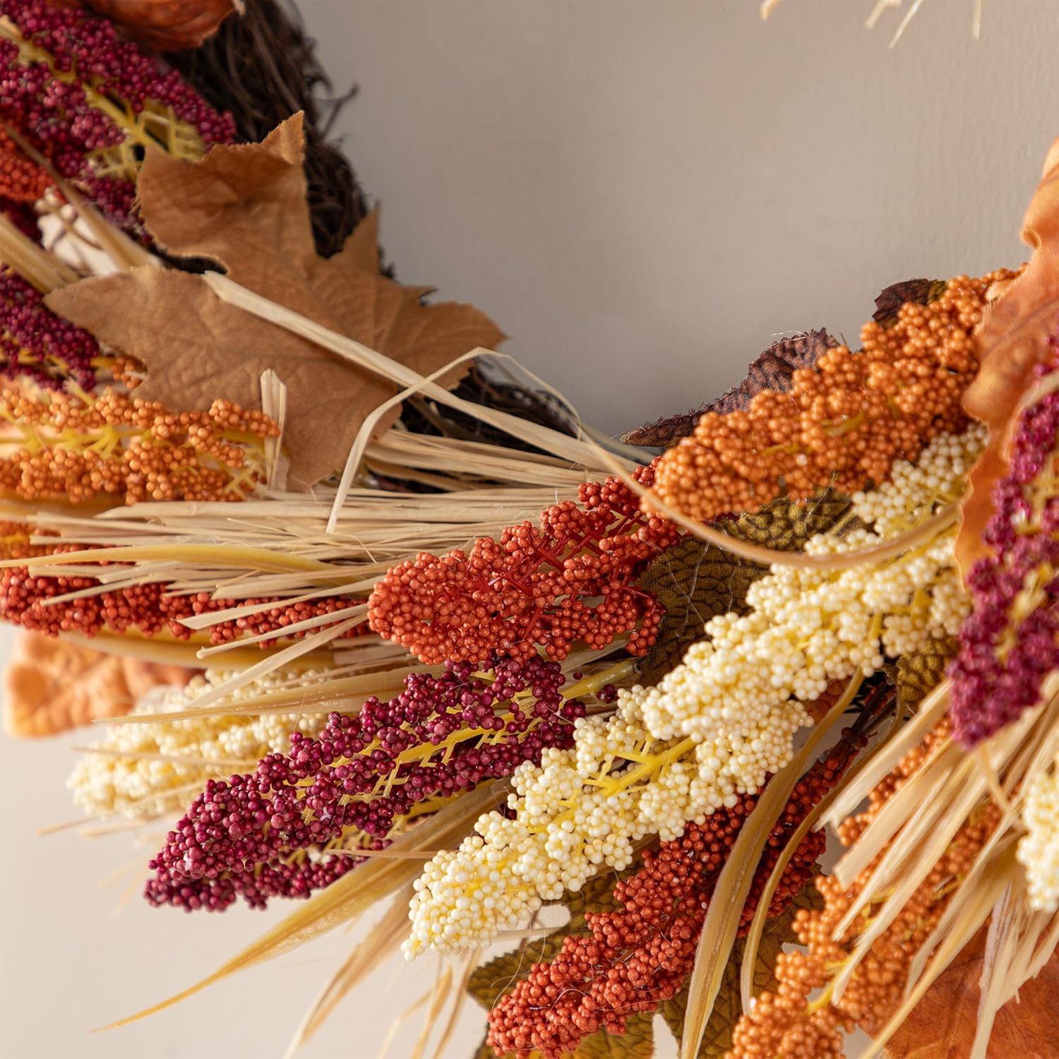 • 【Vibrant Fall Door Wreath】Adorn your entryway with this 24" multi-colored sorghum wreath, featuring rich autumn hues—perfect for fall wreaths for front door seasonal styling.