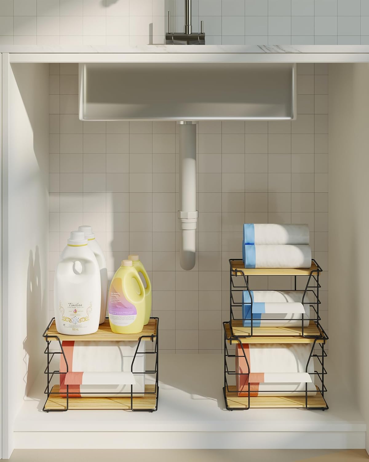 • 【Versatile for Multiple Scenarios】The garbage bag holder works seamlessly in under-sink setups (keeping trash bags within reach), pantry organizers and storage (tidying rolls), and laundry rooms. It’s also a handy kitchen organizer, simplifying home and kitchen tidying as a reliable trash bag dispenser