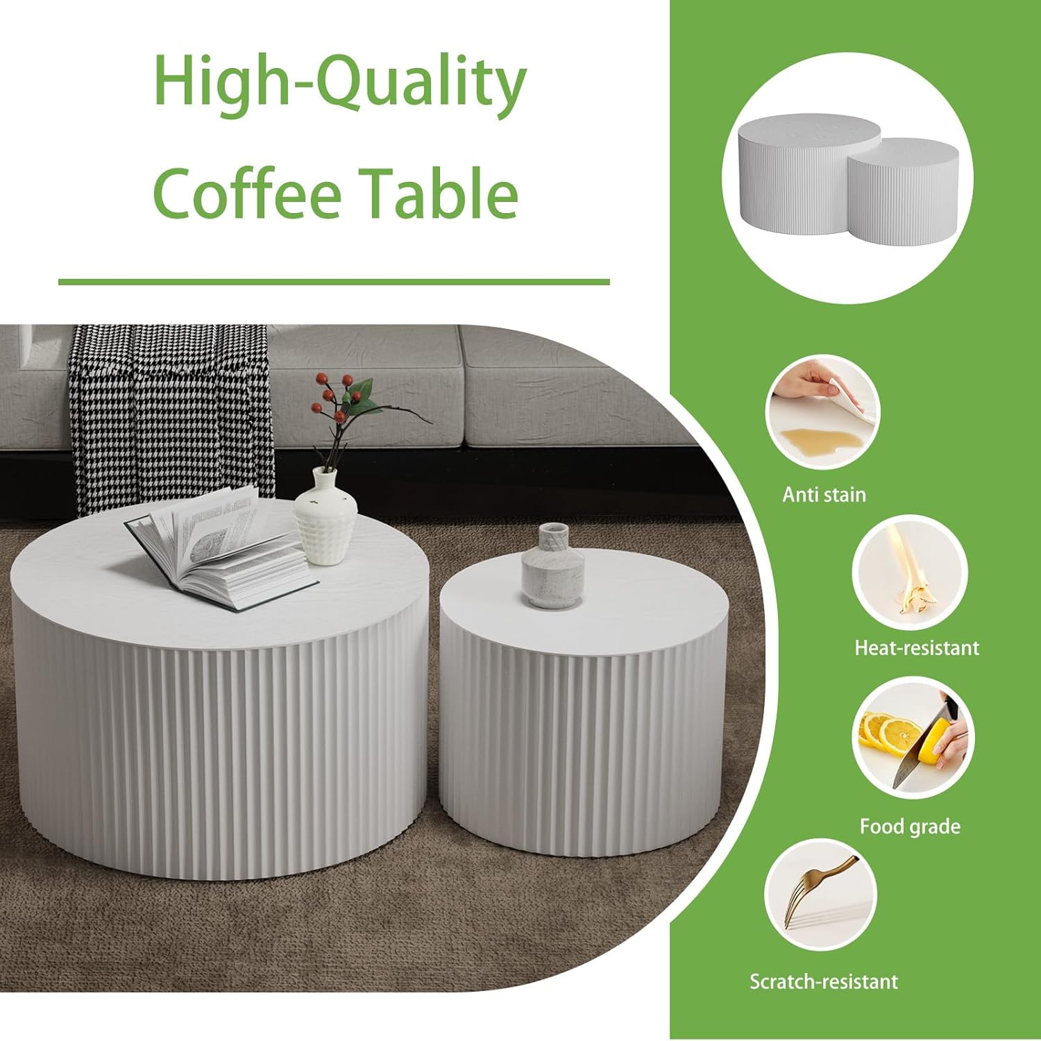 • Density Board Material: The round nesting coffee table is made from high-quality density board, ensuring excellent stability and load-bearing capacity, and the nesting coffee table circle is resistant to deformation. Moreover, the modern nesting coffee table is easy to clean and maintain with the smooth flat surface, providing a reliable experience whether placed in the living room or bedroom.