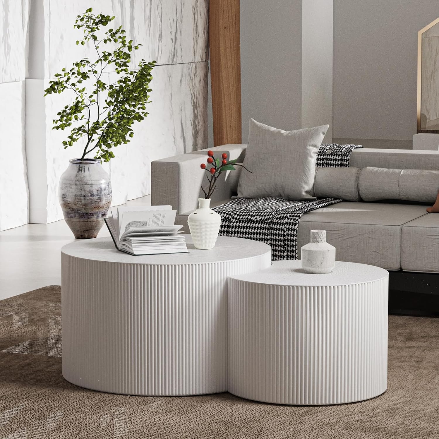 Round Coffee Table Set of 2, Nesting Coffee Table and End Table Set Small Circle Drum Side Table for Living Room Office, No Assembly (D White Crescent)