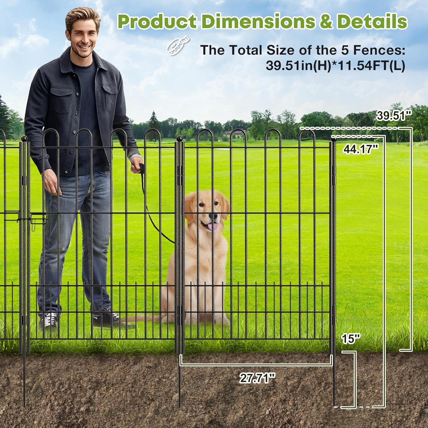 5 Panels Decorative Garden Fence with U-Shape and Latch Gate, 39.51in (H) X 11.54ft (L) Dog Fence Outdoor for Yard Security, Garden Fencing Includes Deep Stakes
