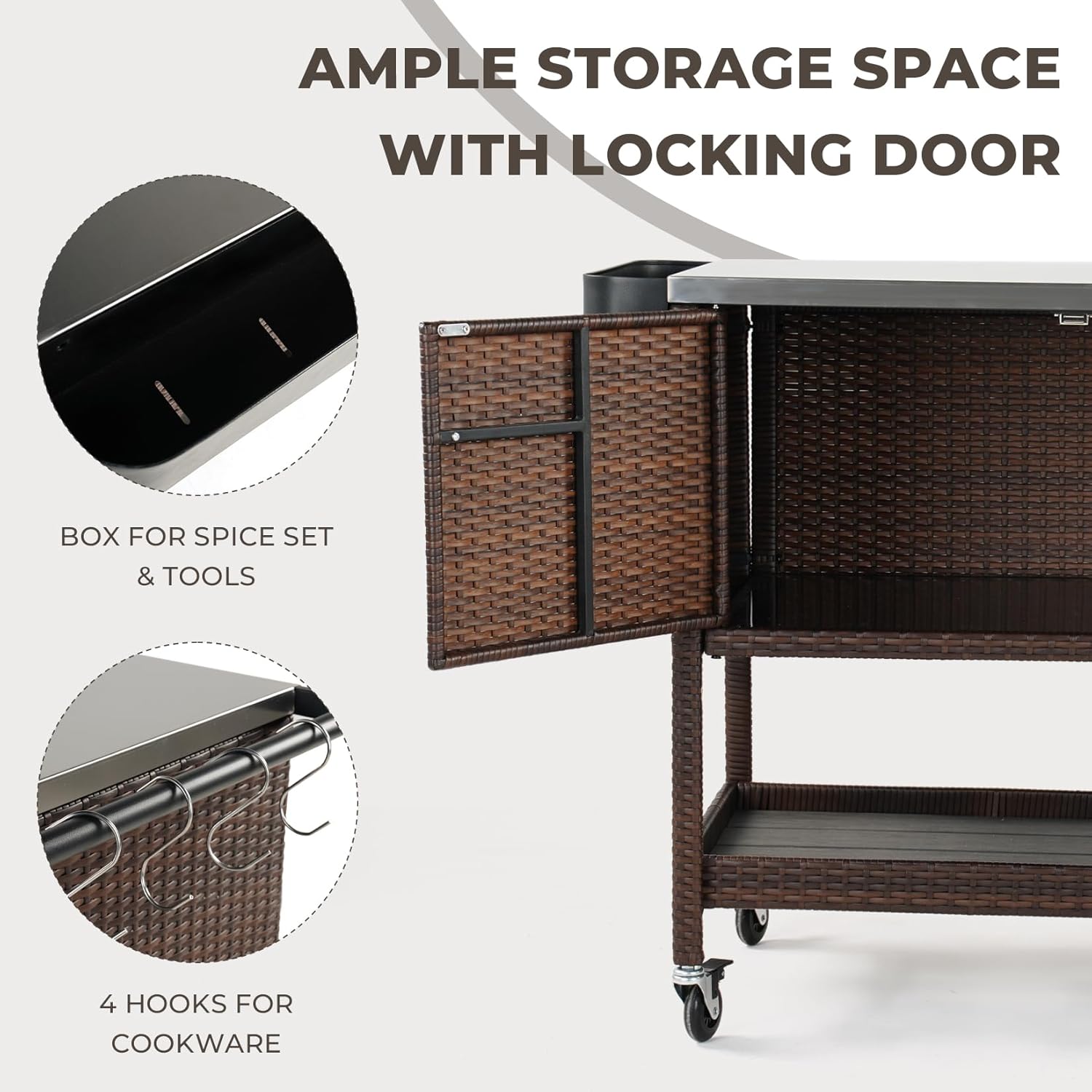 • Large Storage Space: The tabletop of the patio bar cart has a capacity of up to 150lbs. The large storage cabinet equipped with 2 doors can protect food and tableware from sun, dust, stains and rain. The side handle has 4 hooks for hanging barbecue grills, cutting boards, etc. Each hook can bear 19lbs, allowing for the suspension of a propane tank, and other tools