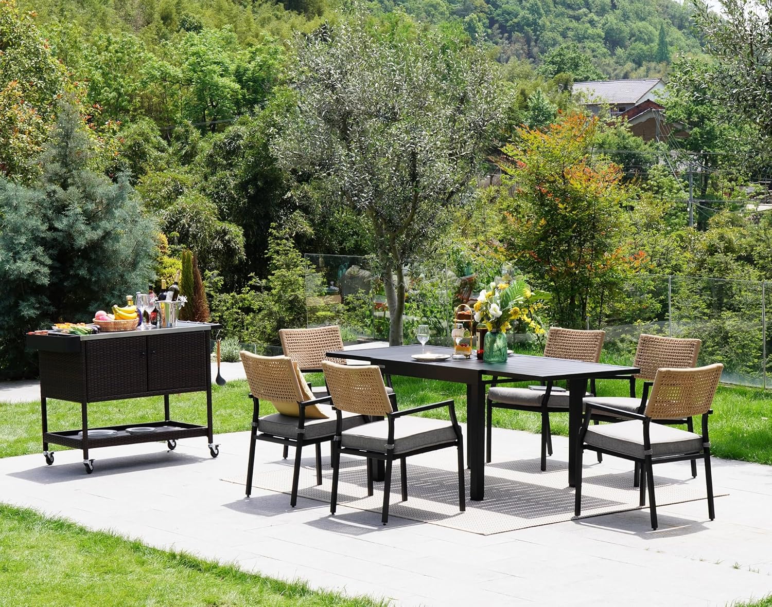 • Multi-Functional Bar Cart: The versatile design serves as an outdoor BBQ grill table, a food serving cart, a side table, or beverage bar, suitable for various leisure activities such as picnics, BBQs, and outdoor gatherings. It brings excellent convenience and compatibility indoors and outdoors