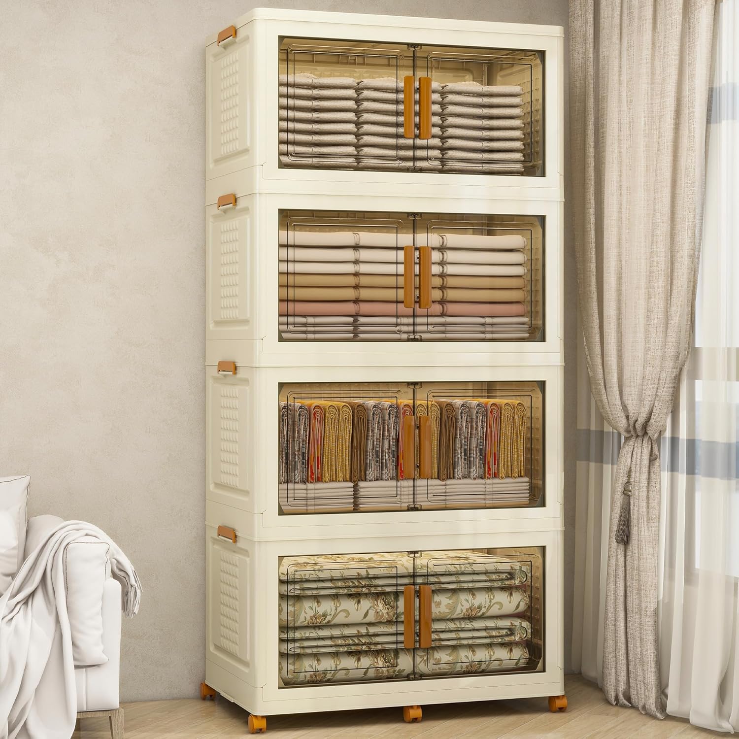 • ELEGANT DESIGN: The storage bins's front door is transparent, allowing easy access to the contents. Each door is equipped with a handle, and the storage bin boasts a stylish and minimalist appearance, fitting seamlessly with various furniture. The foldable storage box can be stacked according to your needs, and four movable wheels are built into the bottom, facilitating easy movement as required.