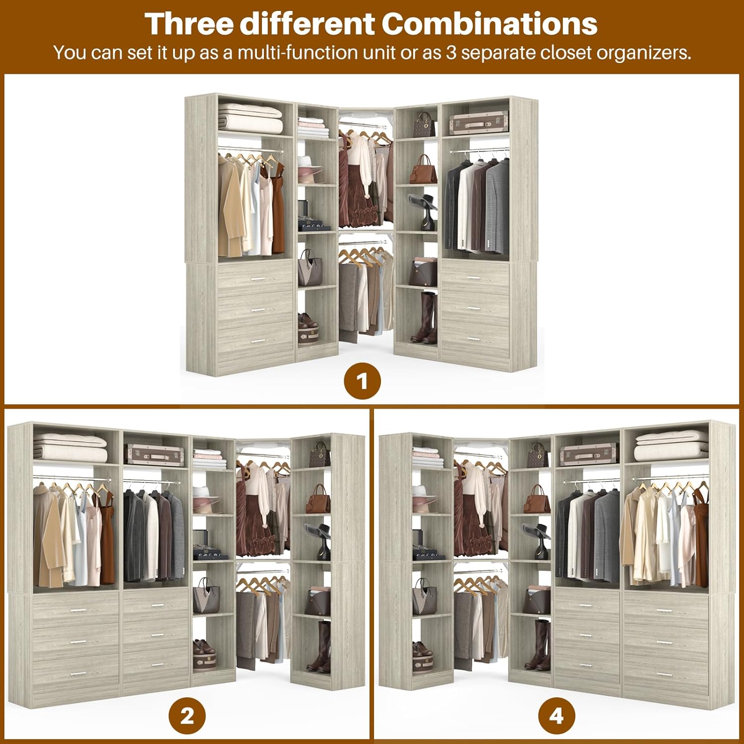 • Besiost closet system with 2 sets will surely fit your needs. The closet system set consists of a corner closet system with 12 shelves + a closet system with 3 drawers. Total 2 large wooden drawers, 3 hanging rods, and 15+ storage shelves for t-shirts, pants, jackets, hats, bags, suitcases, etc. Hold up to 400+ clothes and small items. Visualized storage keeps everything neatly in place and within easy reach.