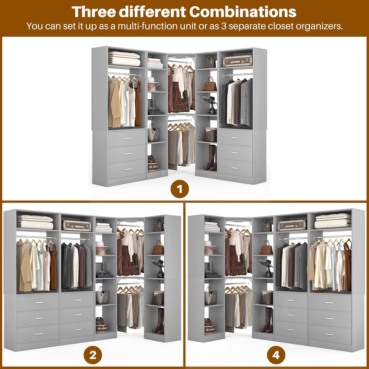 Corner Closet System with 6 Drawers, Closet Organizer System with 14 Shelves & 4 Hanging Rods, 87.2"L * 39.2"W / 63.2"L * 63.2"W Reversible L Shaped Walk-in Closets, Load 2500+LBS, Grey