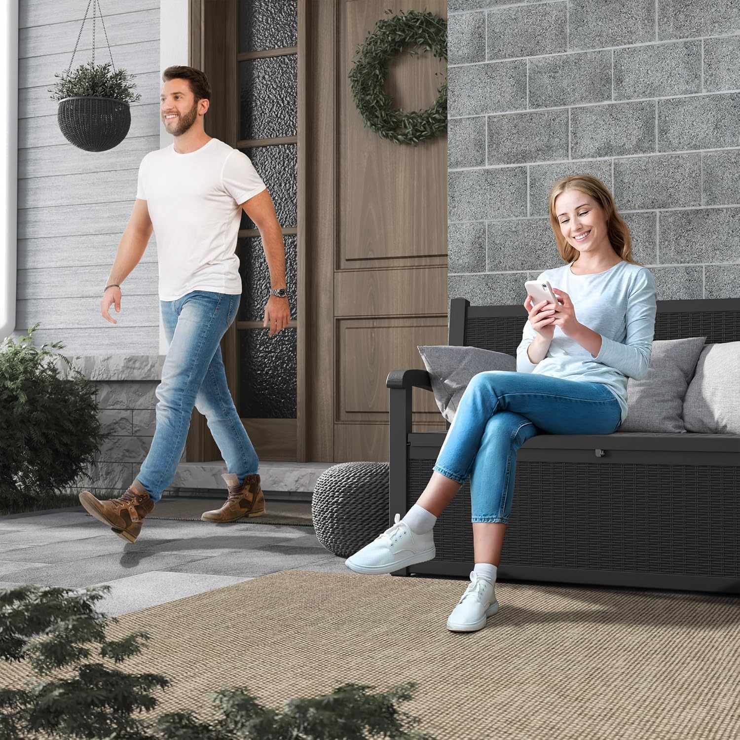 • Comfortable Seating: Beyond being a storage bench outside, it functions as a cozy seating option, the bench seat is spacious enough to seat 2–3 people, with a weight capacity of 500 lbs. Designed as a practical patio bench with storage, it includes a backrest and armrests to enhance comfort, making it perfect for relaxing after outdoor activities.