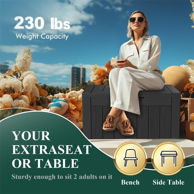 • ADAPTABLE TO VARIOUS SCENES: Whether used as an indoor laundry storage chest or an outdoor deck box container for items like outdoor cushions, garden tools, pool accessories, and sports equipment, this patio storage box provides abundant space. It's also versatile as a side table, yard seat, storage bench, or footrest