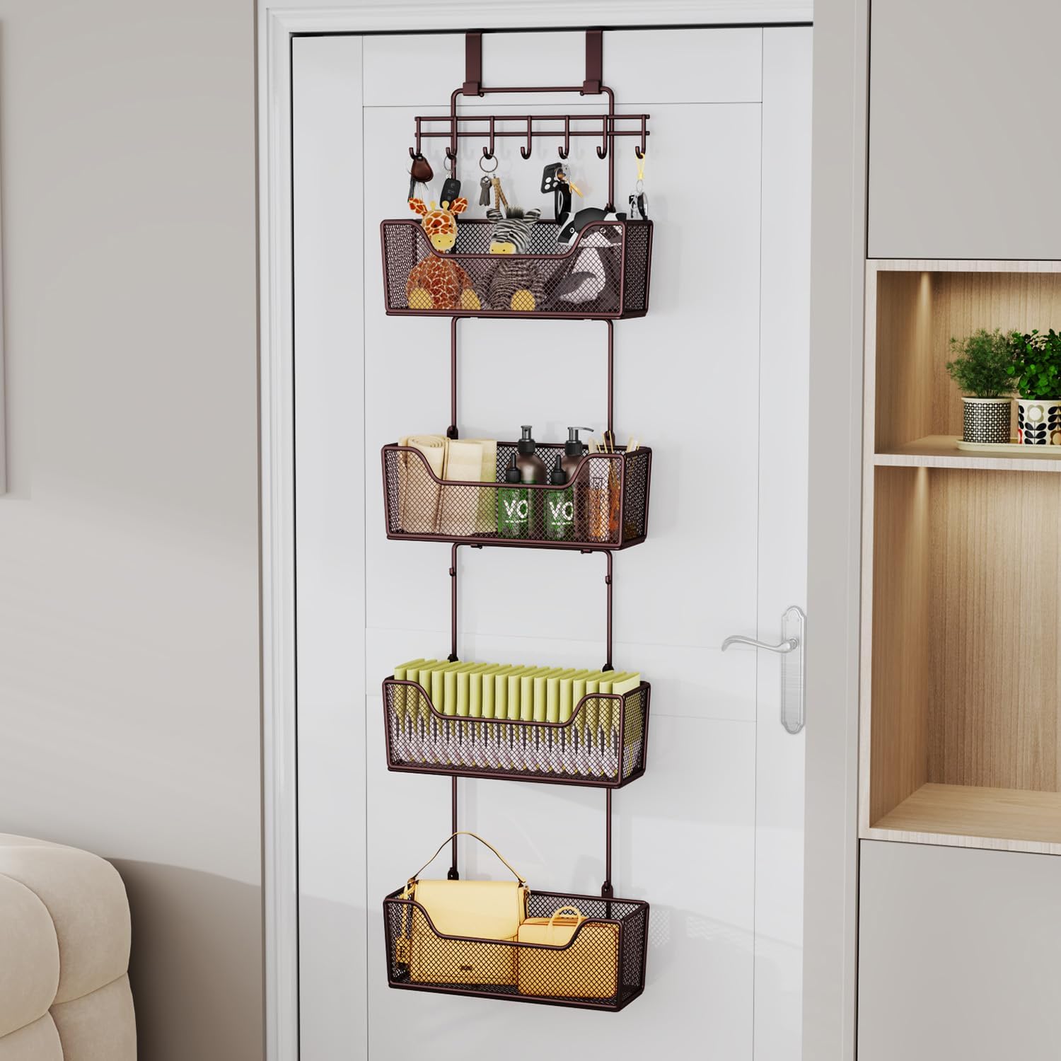 • [Super large capacity storage basket with hooks] Unlock the potential of your space with our over the door organizer. Our over the door storage has 4 large-capacity baskets that can effortlessly accommodate your essentials, and baskets are mesh-designed to hold smaller items at the same time! Neatly hang and store a variety of items, from towels to accessories, thanks to the convenient row of hooks. Say farewell to clutter and welcome a tidier, more efficient life with this over door organizer space-saving solution