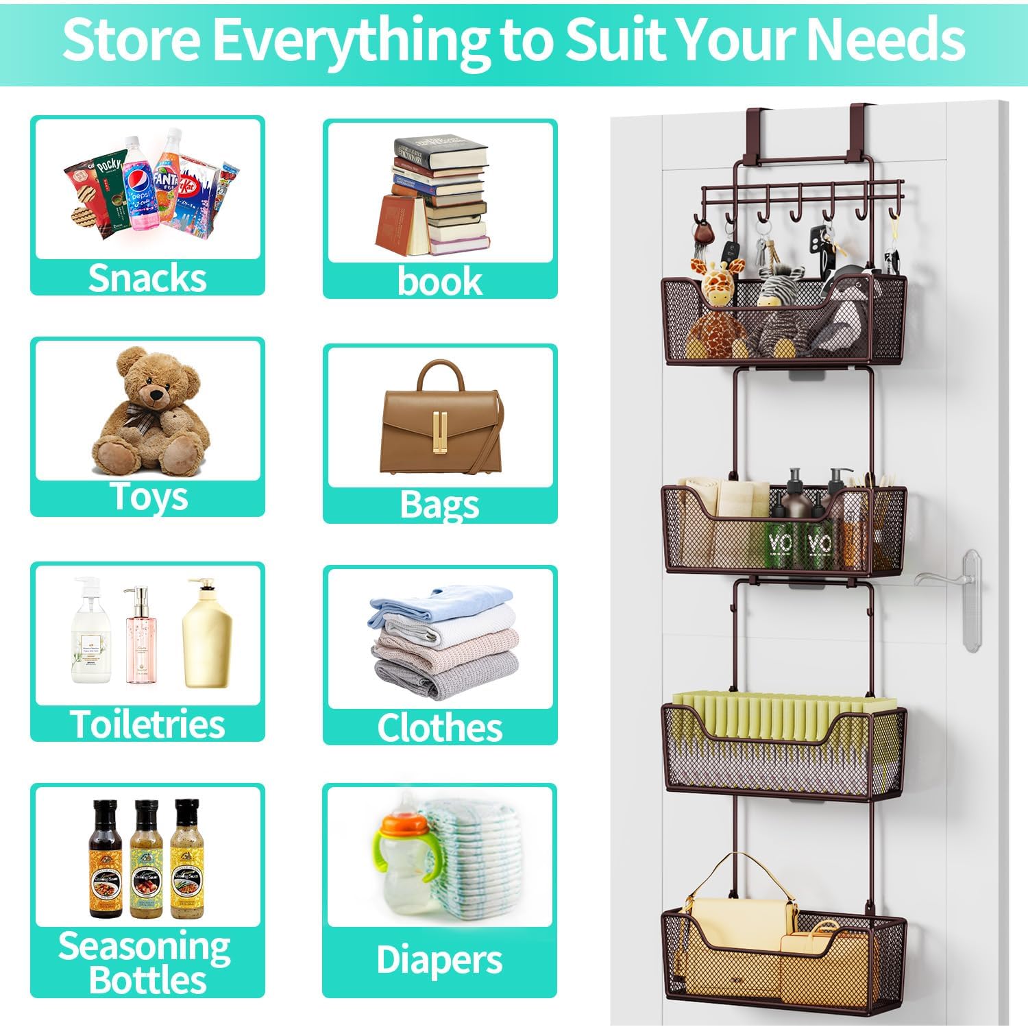 • [Multipurpose over door storage organizer] Whether it's in the kitchen, bathroom, bedroom, or any room, this door rack organizer's multifunctional design adapts to your needs. The back of the door organizer can store bathing products, cosmetics, towels, dolls, bags, baby products, snacks, bottles, spice bottles, within arm's reach