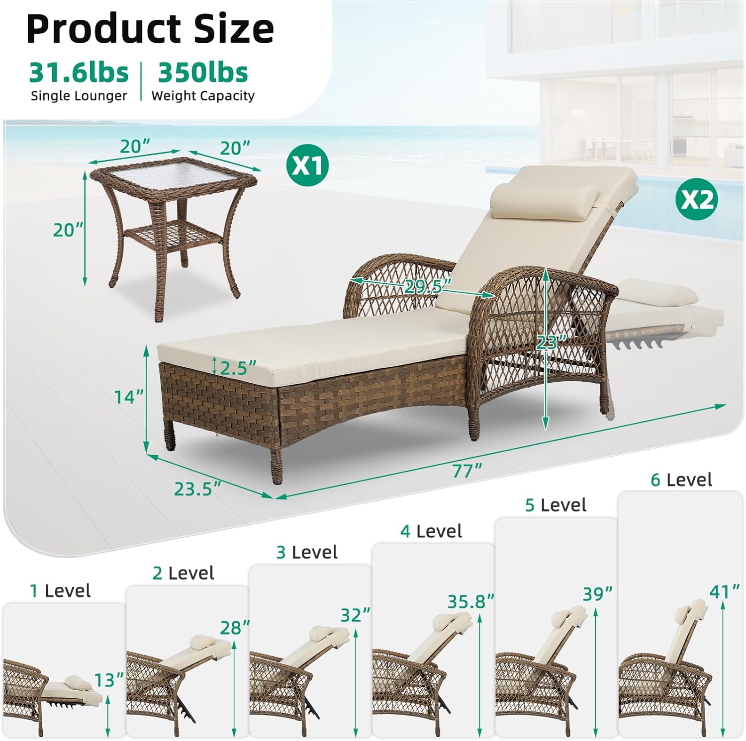 • Durable & Weather-Resistant Material: Crafted with hand-woven PE rattan and a powder-coated steel frame, this outdoor chaise lounge set is built to withstand all weather conditions, offering long-lasting durability without fading or cracking. Light in weight but heavy on strength, the wicker lounge chair supports up to 350 pounds while weighing just 31.6 lbs