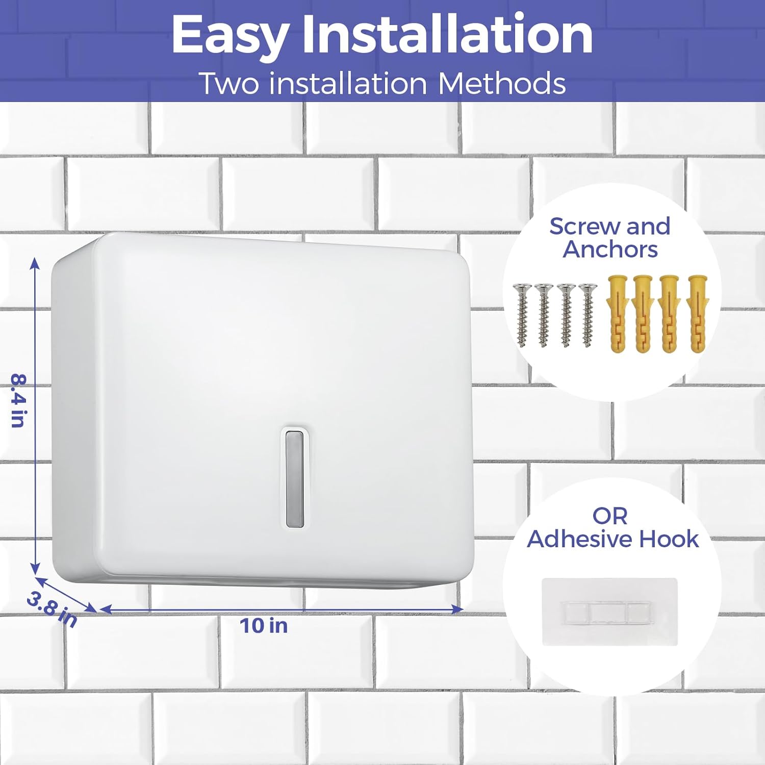 Multifold Paper Towel Dispenser Wall Mount (White) – Large Capacity C-Fold, Trifold, and Folded Commercial Hand Towels Holder for Bathroom & Restroom – Adhesive or Screw Mounted