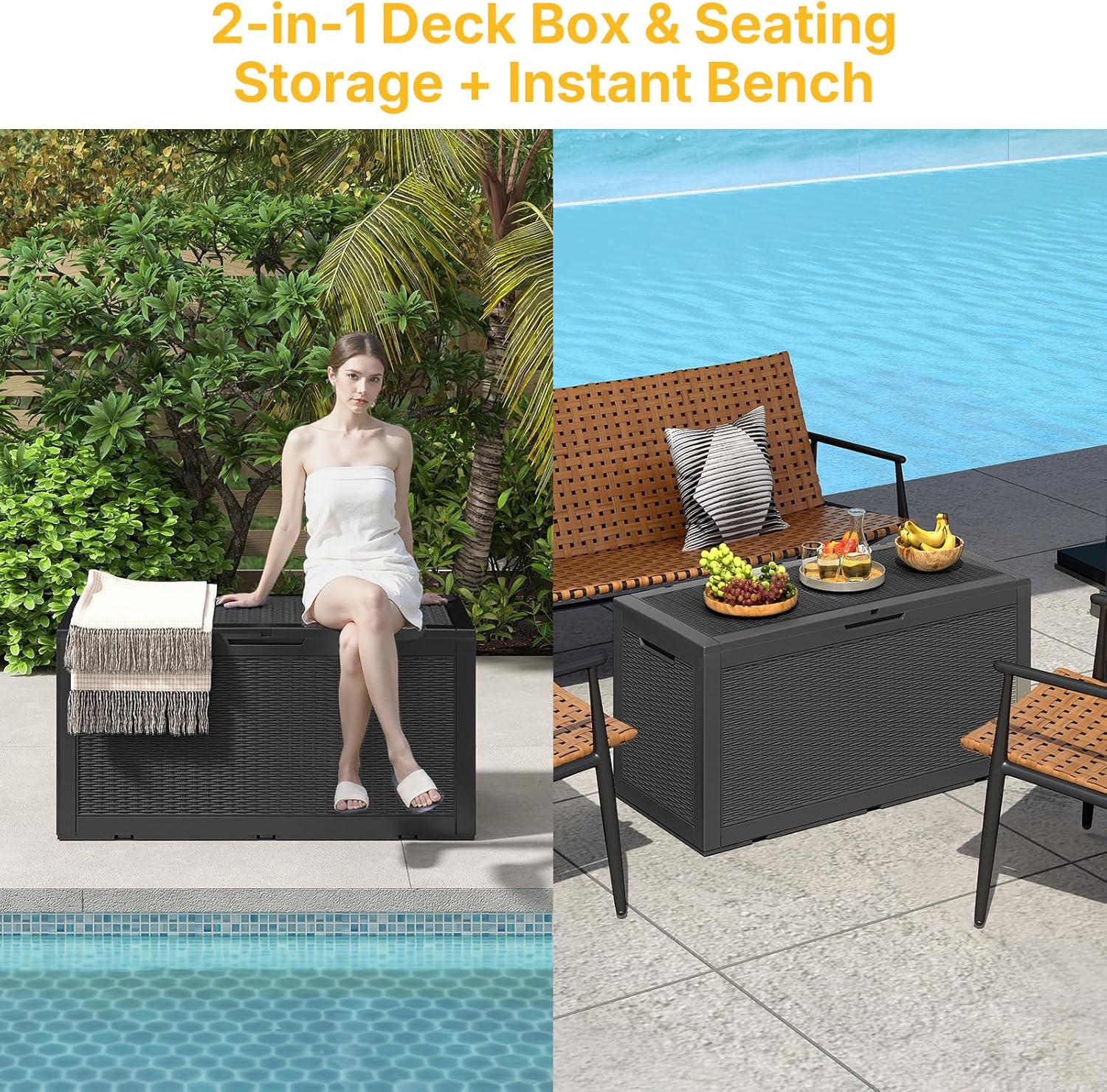 • 【All-Weather Design】Elevate your outdoor space with this premium rattan-pattern resin deck box. The construction maintains its rich woven appearance season after season, resisting fading from intense sun exposure. Perfect for complementing patio furniture sets by the pool, garden or porch.