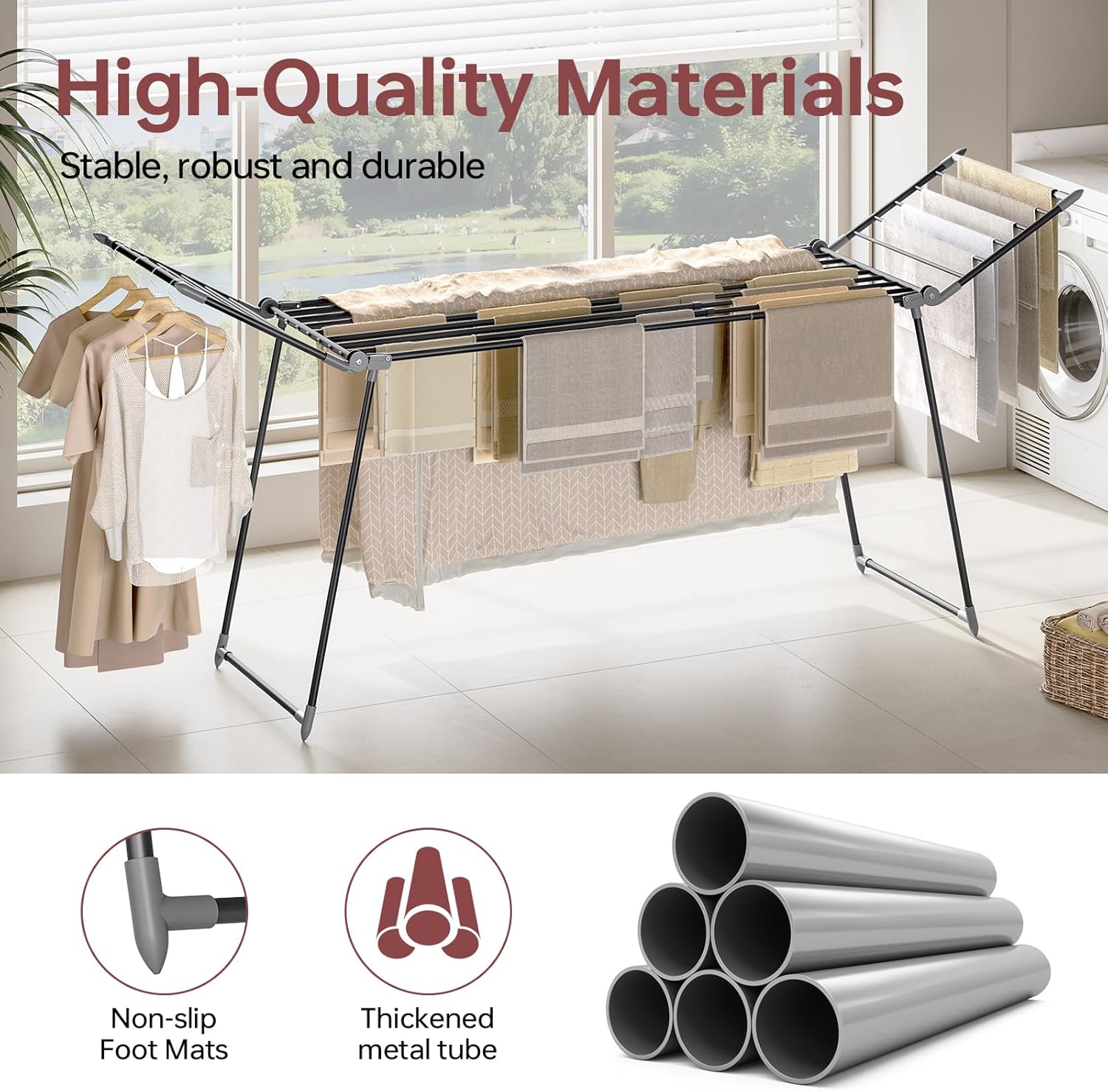 • Premium Built - The foldable dryer rack is made of heavy duty metal and hard plastic to ensure the stability and durability of the drying rack. The coating layer gives the clothes drying rack a rust-free and elegant looks for indoor and outdoor use
