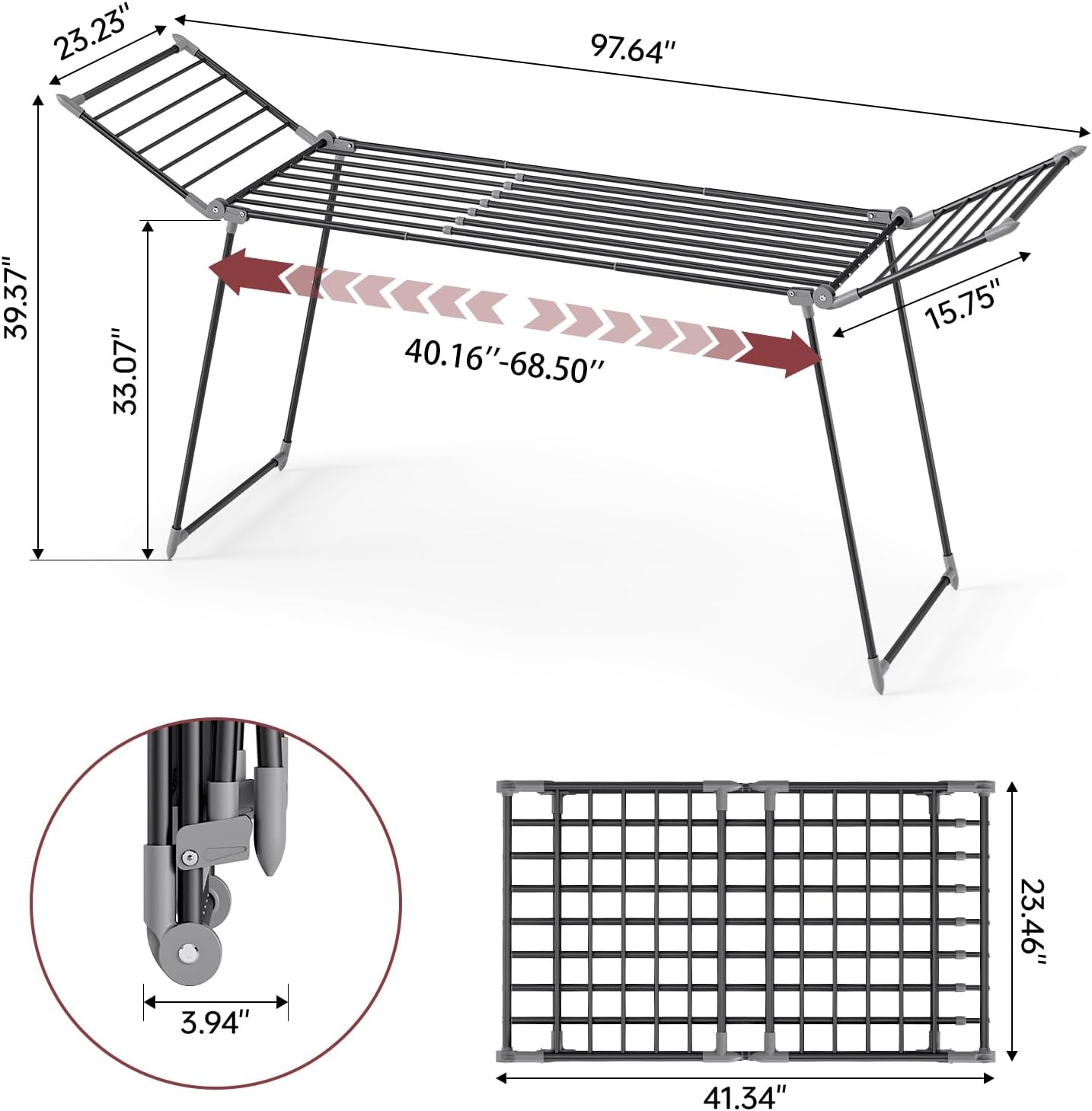 • Large Drying Capacity - The drying space of Apexchaser clothes drying rack is 97.6" X 23.2" X 39.4". The clothes airer has 9 long pipes which can be extended and 12 short pipes which can dry a full load of clothing in one go