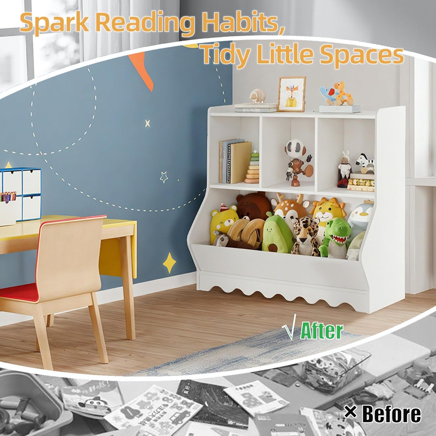 • ⭐️All-in-One Kids Bookshelf & Toy Storage: This multifunctional children’s bookcase combines three upper cubbies with a large bottom bin, offering plenty of space for books, toys, and art supplies. Say goodbye to messy toy bins and keep your child’s room neat, organized, and inviting.