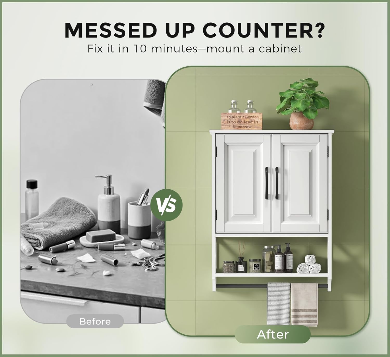 • Clean White Finish with Durable: Crafted from moisture-resistant engineered wood with a smooth white painted finish, this wall cabinets for bathroom storage offers a clean, timeless look that blends beautifully with modern and traditional bathrooms alike.