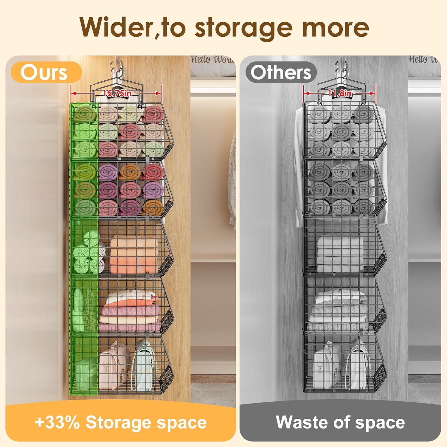 • 4'' Extra Space Design Hanging shelf & 5 Tier Wire closet hanging organizer: 👔This design is 4 inches deeper than ordinary wardrobe hanging baskets, fitting more snugly against the back wall of the cabinet. It can be adjusted to utilize unused space caused by the insufficient size of ordinary hanging storage, expanding dorm closet organizer space and making it more suitable for most people's wardrobes 👔The deepened storage closet fits more securely into the wardrobe, reducing shaking by 90%