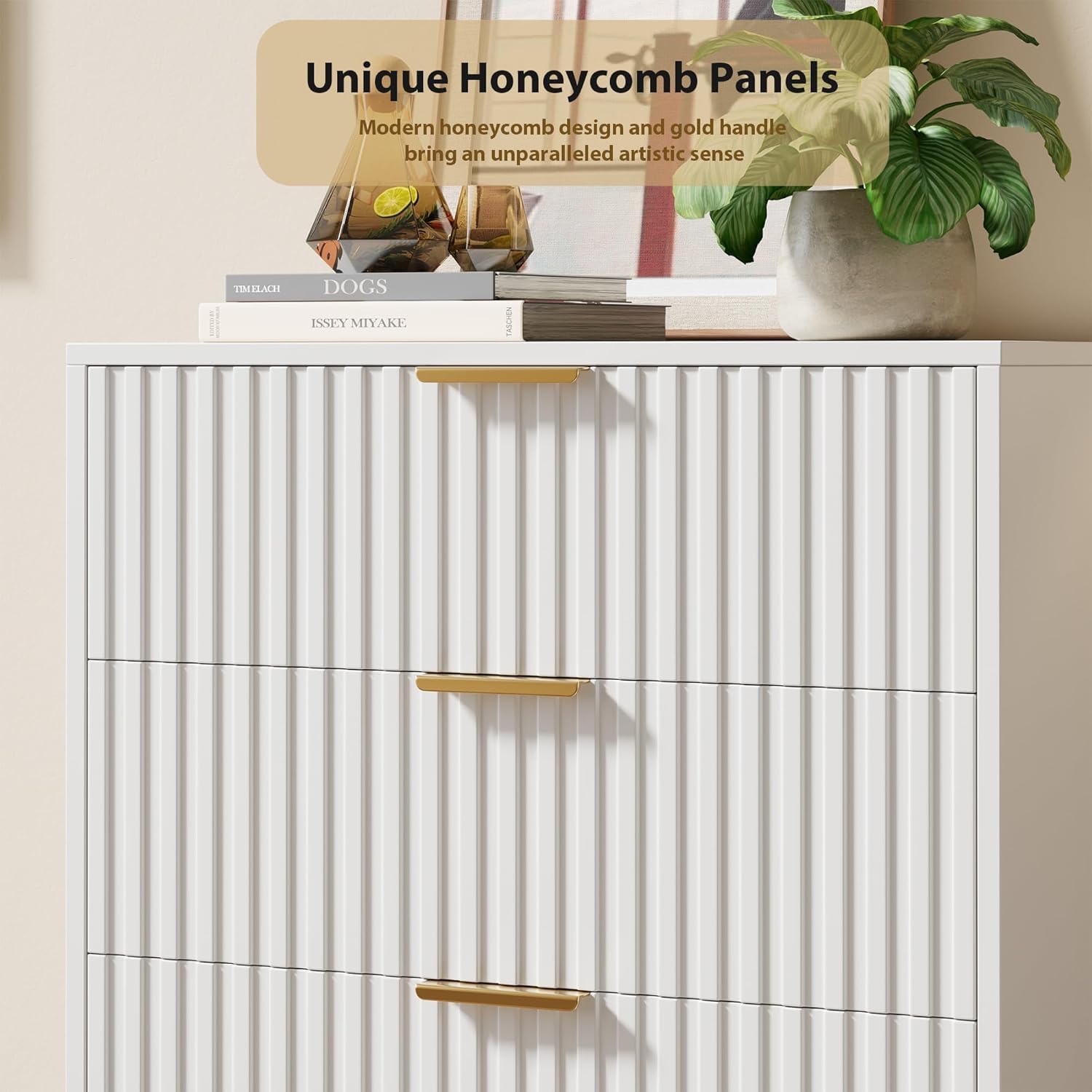 • Luxurious & Elegant Design: 5 drawer dresser for bedroom is a true masterpiece in design, functionality, and luxury. Tall 5 drawer dresser with fluted design panels and gold leg support design offers the perfect combination of style and convenience. White 5 drawer dresser will look great used as a chest of drawers.