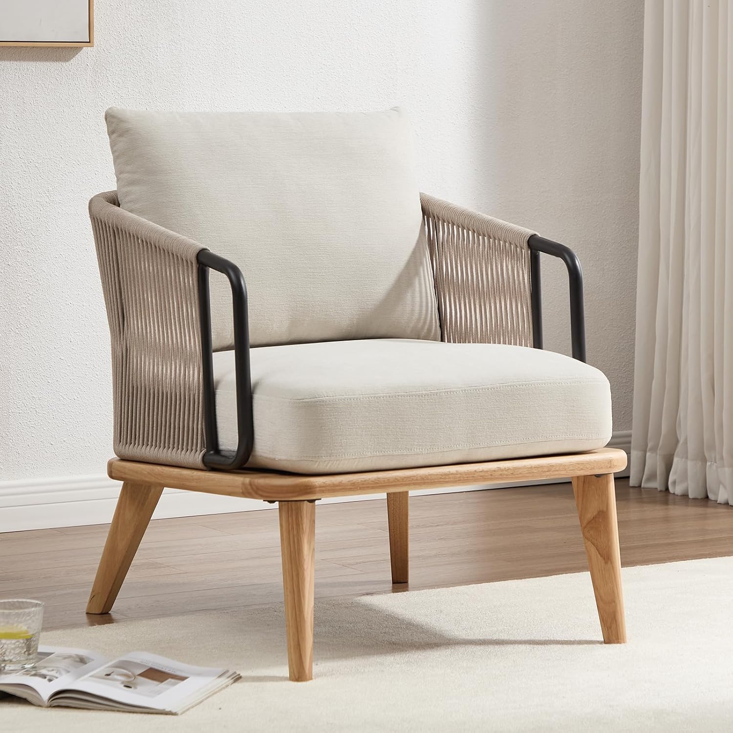 • Mid-Century Style: The modern sitting chair blends classic mid-century design with modern materials. Clean lines, open-frame silhouette, and angled legs reflect timeless retro charm. Built with a durable frame and weather-resistant rope, ideal for both indoor and outdoor use. Works great as a sitting chair in the living room, a reading chair in a nook, or a bedroom chair near a window