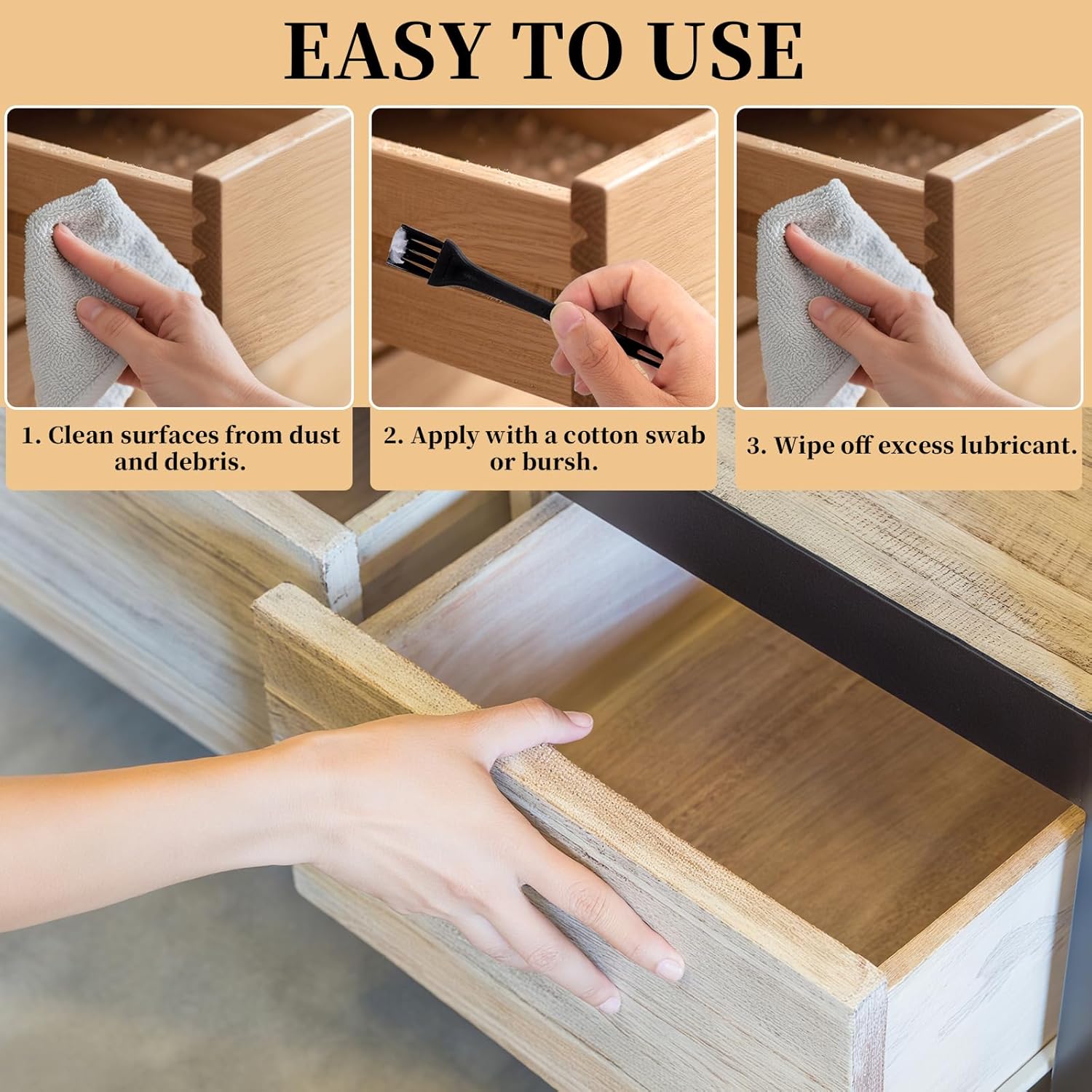 • Effortless & Quiet Operation: Eliminates squeaks and sticky movement (e.g., stubborn drawers/doors) by reducing friction. Prevents splinters; Apply with a cloth, fingers, or included gloves/rags for mess-free use.