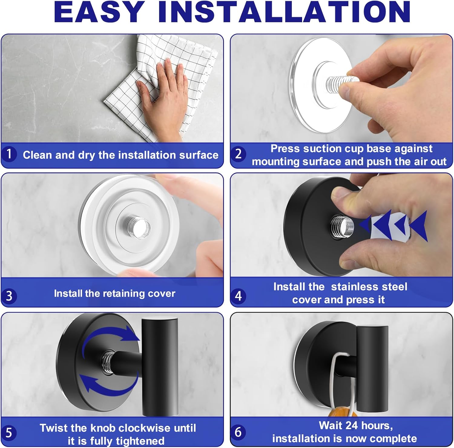 • [Effortless Setup in 3 Steps]: 1. Clean & Dry a smooth, non-porous surface; 2. Loosen the hook counter-clockwise, take out the suction cup base; 3. Press the base against the surface and twist the knob clockwise until fully tight. Watch our video for detailed instructions.