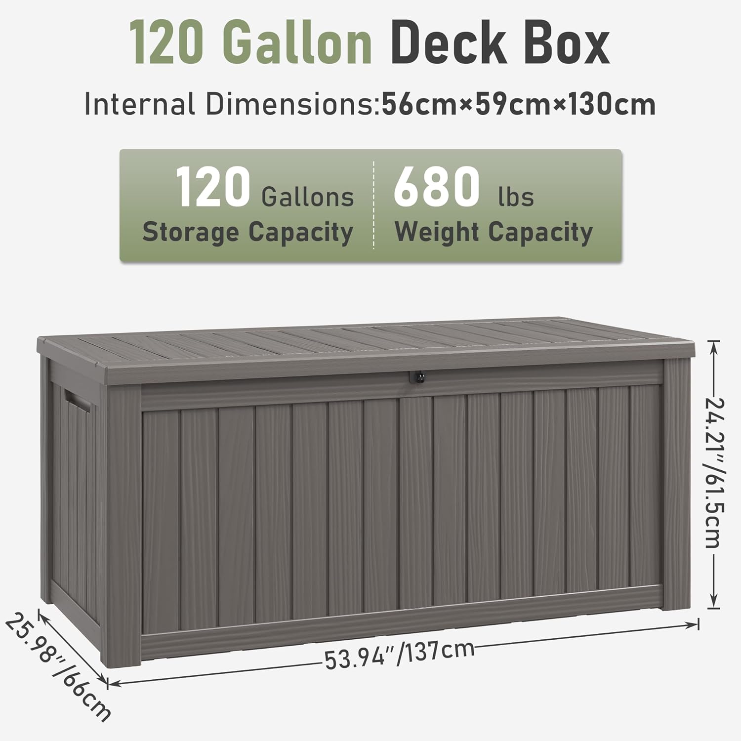 KAMABOKO Outdoor Storage Box, 120 Gallon Large Outdoor Resin Deck Box, Storage Waterproof Boxes Lockable Lid for Garden Tools, Pool Supplies, Patio Furniture and Cushions, Grey