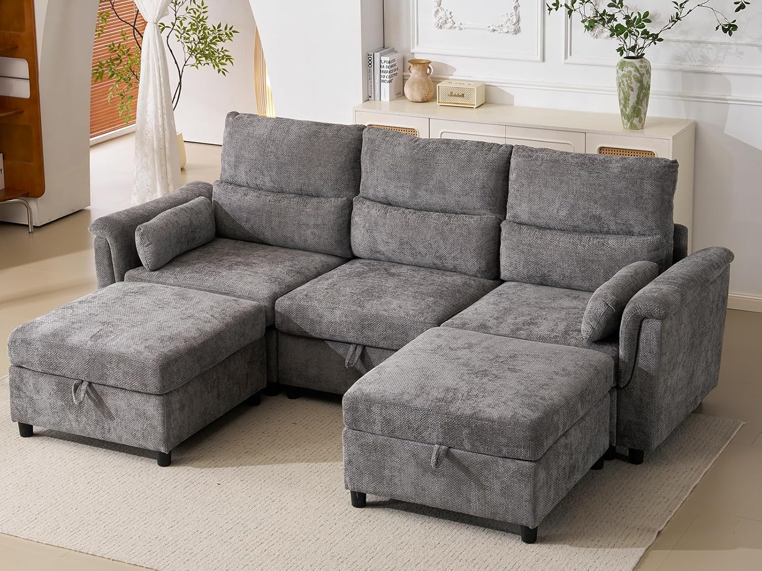 • Large storage space: Each seat of the modular couch is equipped with a spacious storage space, perfect for storing blankets, toys, pillows, and other items. This thoughtful design keeps your living space neat and tidy while maintaining a combination of comfort and functionality.