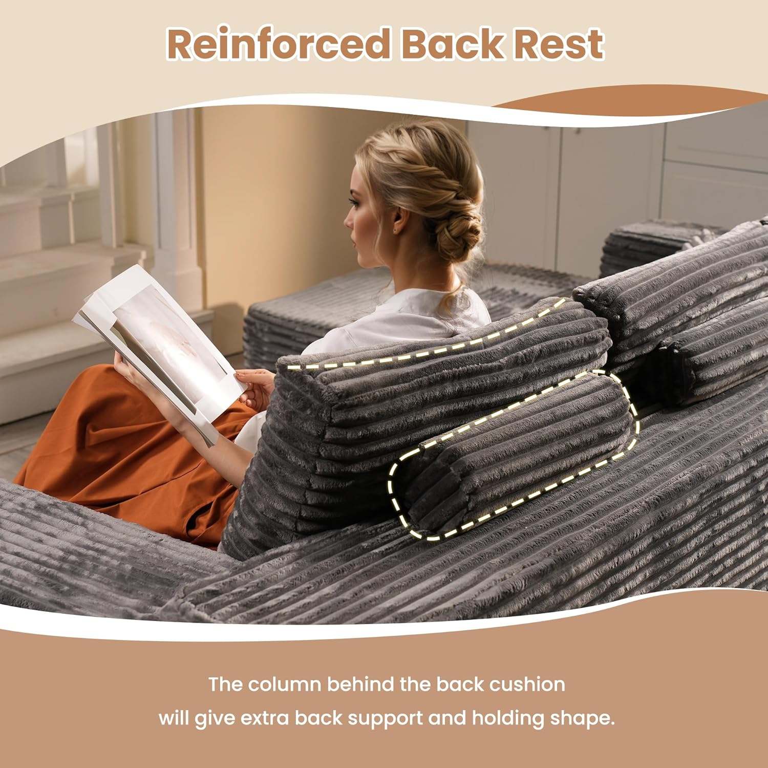 • Re-Enforced Back Support: Sepecially design a supportive back column behide the back pillow to re-inforce the back support and hold shape overtime