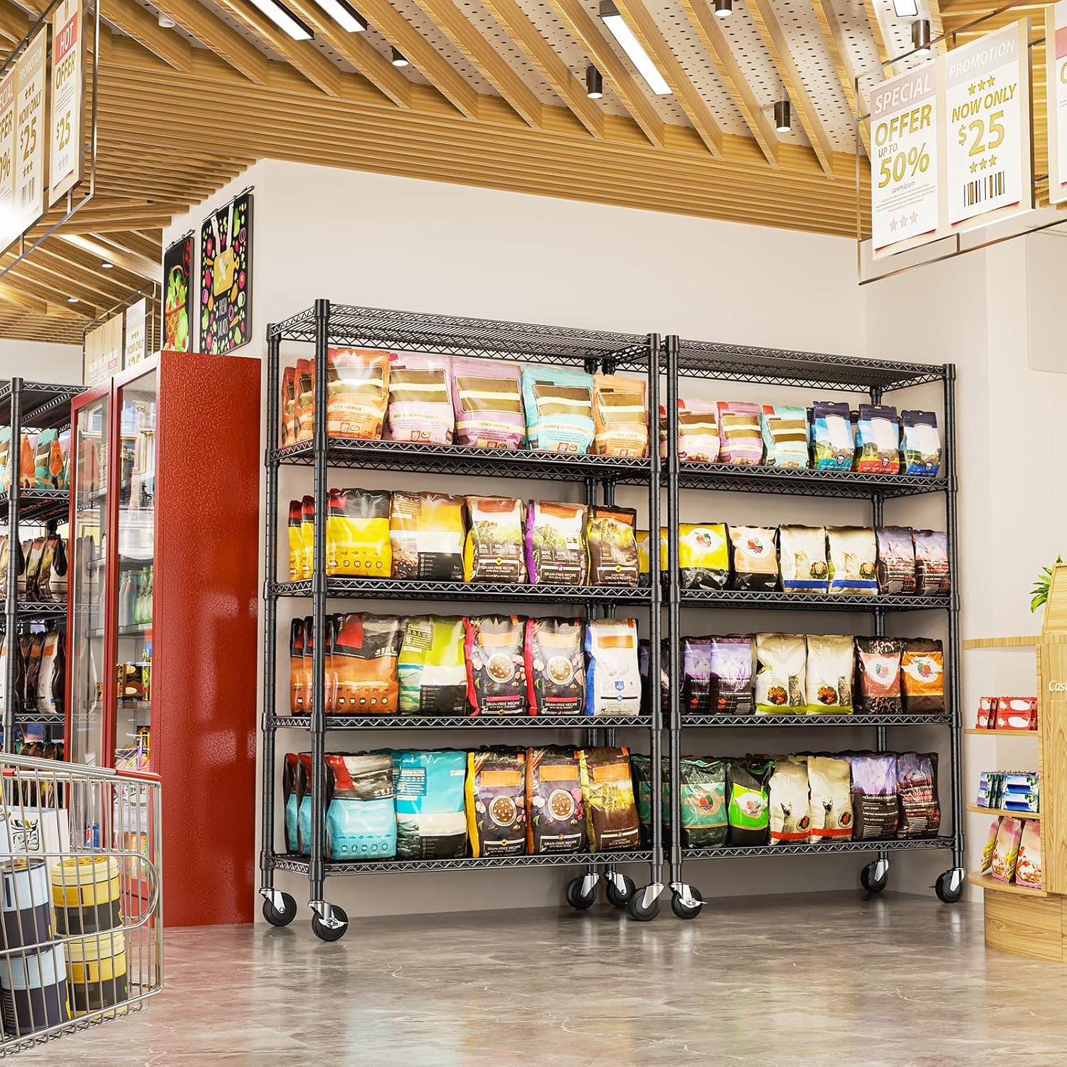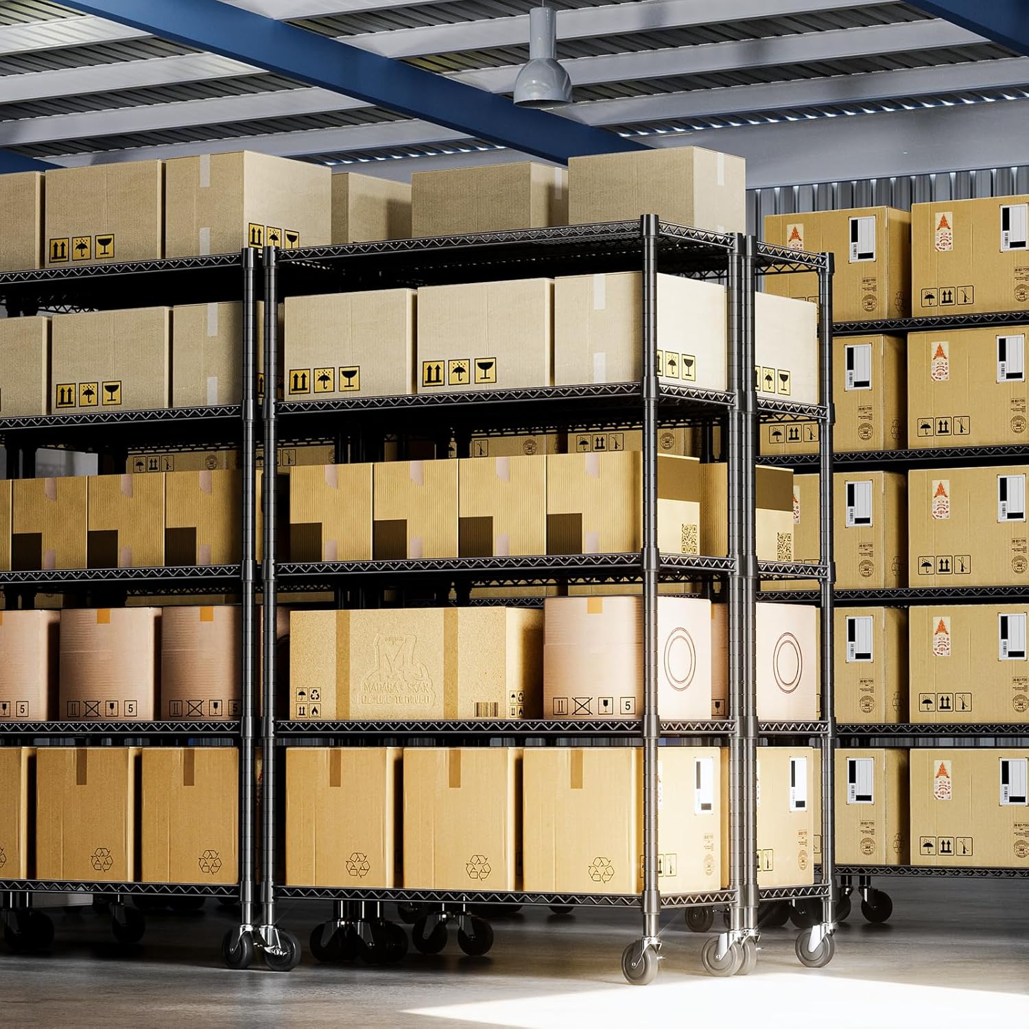 • COMMERCIAL-GRADE HEAVY DUTY – Made from high-quality carbon steel with 25.4mm reinforced rods, this heavy duty garage shelving supports up to 660 lbs per shelf and 2640 lbs total on leveling feet (approx. 530 lbs on wheels).