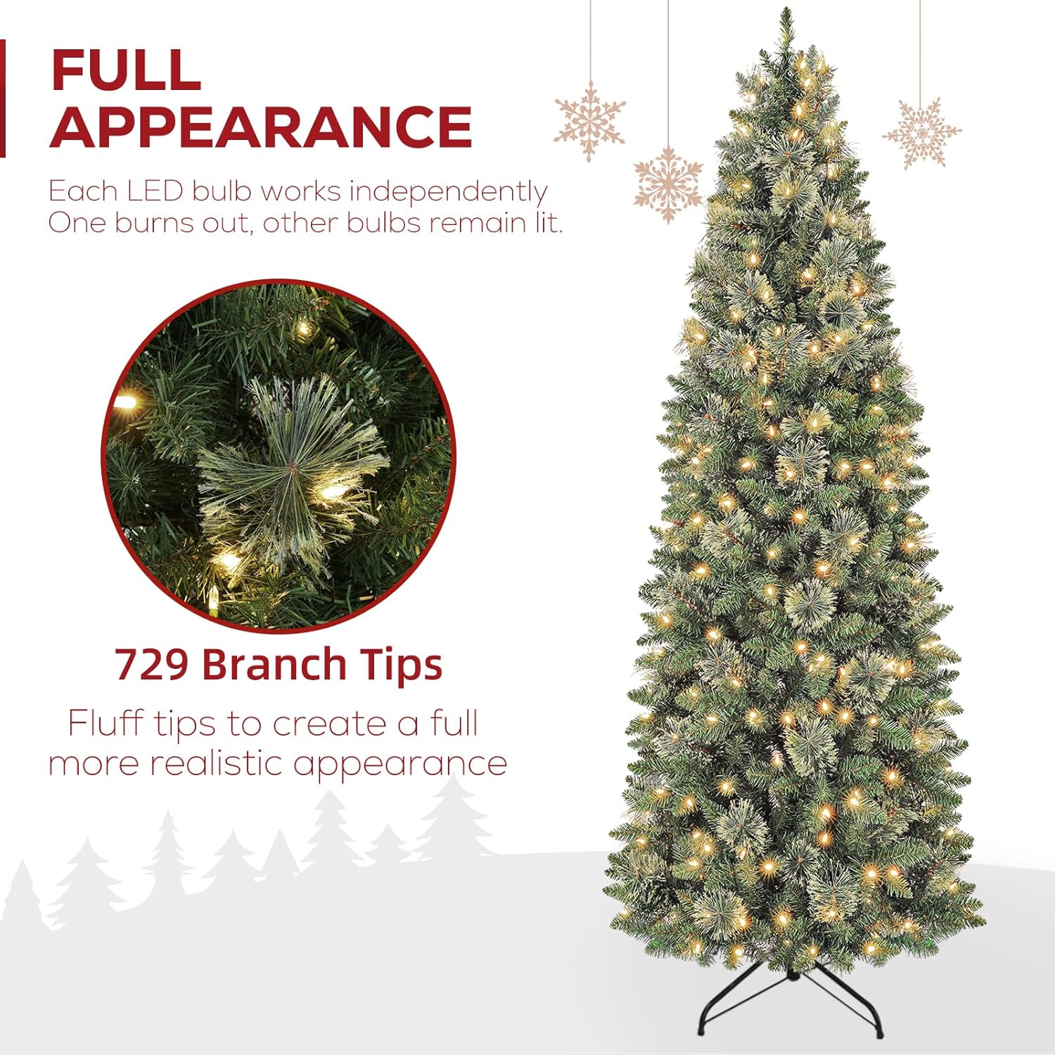 • Sturdy & Durable Construction​​: Built to last, this slim prelit tree combines robust materials with safety in mind: metal hinges ensure secure branch articulation, a sturdy metal stand provides unwavering stability, fire-resistant PVC branches offer peace of mind, and UL-listed LED bulbs deliver reliable illumination.