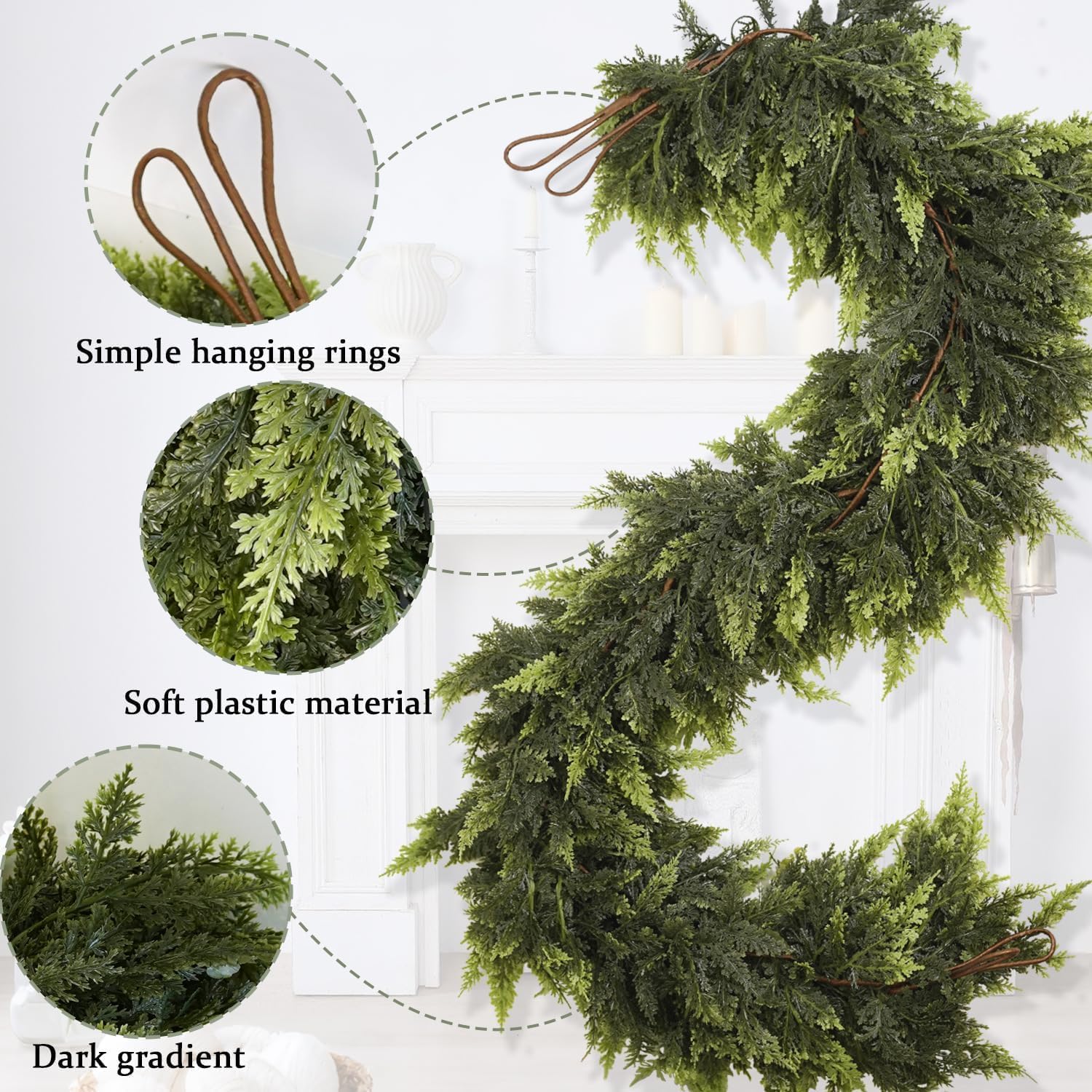• 【Lush, Thick & Realistic Feel】Crafted with high-quality materials, this cedar pine needles garland offers an ultra-soft, lifelike texture that feels like genuine cedar. The full, dense foliage drapes beautifully, adding a fresh and festive atmosphere to your home, whether displayed on a mantel or hung across walls