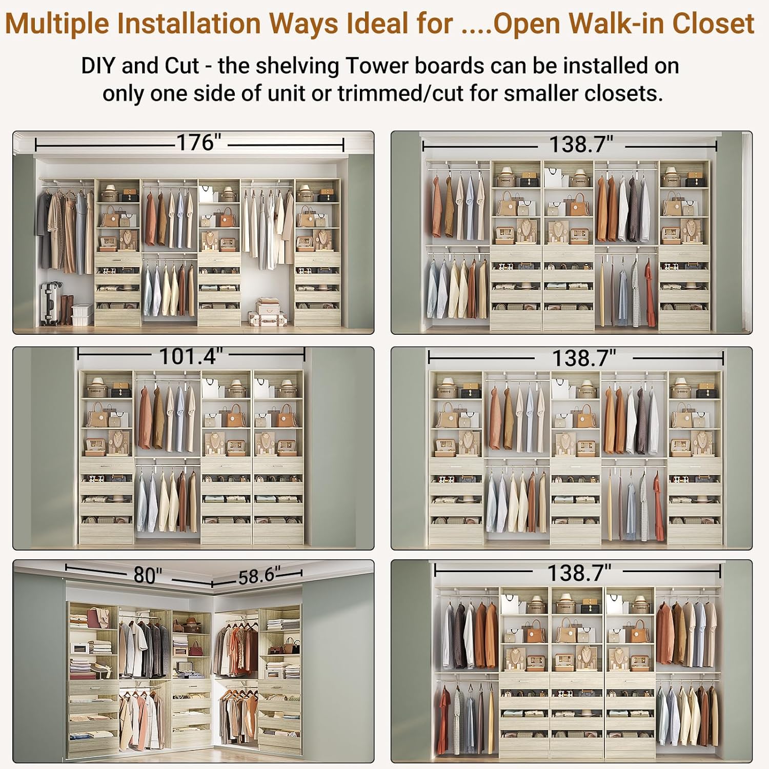• 【Customize and DIY Your Dream Walk-in Closet】With 4 expandable hanging rods, 4 top shelves and 3 closet towers, you can easily create a personalized closet system tailored to your space. Home organization system for walk-in closet spaces to store shirts, jackets, sweaters, pants, shoes, or other décor items. Multiple Installation Ways, Cut to fit more Wide Spaces.