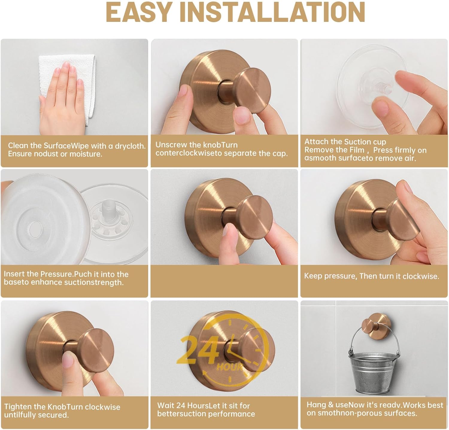 • 【Effortless Installation without Damage】 Say goodbye to drilling or screws! Simply press or twist the hook onto any smooth, dry surface in seconds. It’s detachable, reusable, and leaves no marks — perfect for renters or anyone looking to avoid wall damage