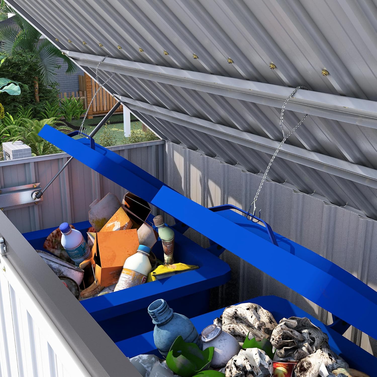 • Portability and Security: When used as an outdoor trash can storage, the design includes independent, upward-opening lid hooks that attach directly to the garbage can lid. A hydraulic mechanism ensures smooth opening and closing. Lockable double doors extend to 47 inches, allowing for the storage of longer items like bicycles and enhancing security, making it a versatile solution for both bike storage and outdoor storage.